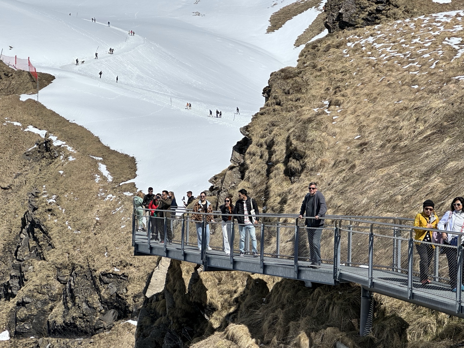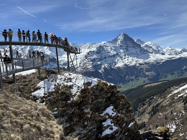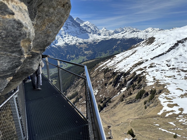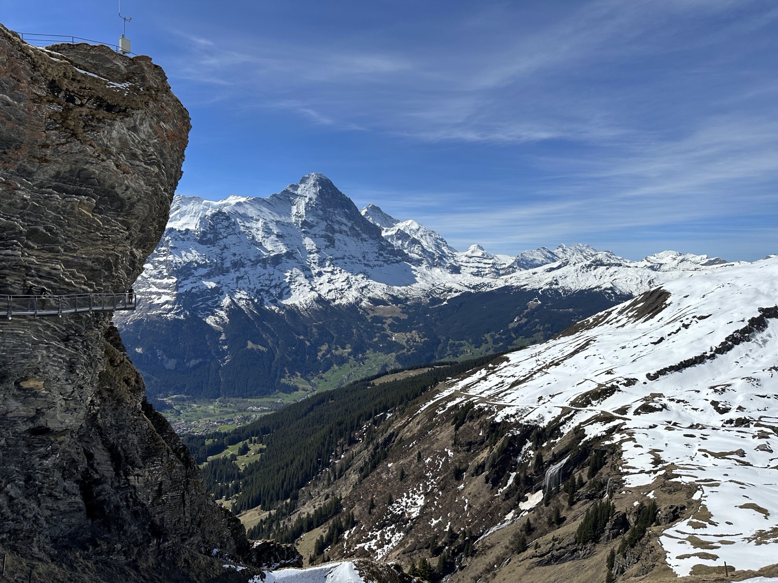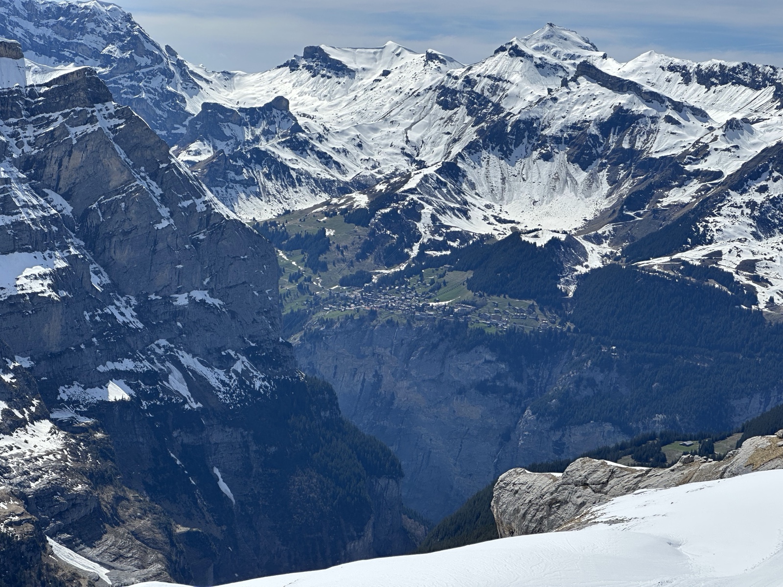 Across the massive chasm between Eigergletscher and the mountain on the other side was a little village nestled onto a ledge above a huge cliff. It probably didn't seem precarious if you are there, but from here it looked like it could just fall right in.