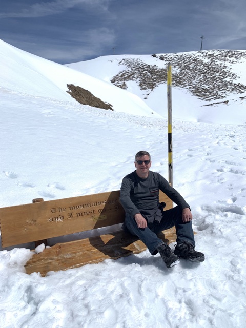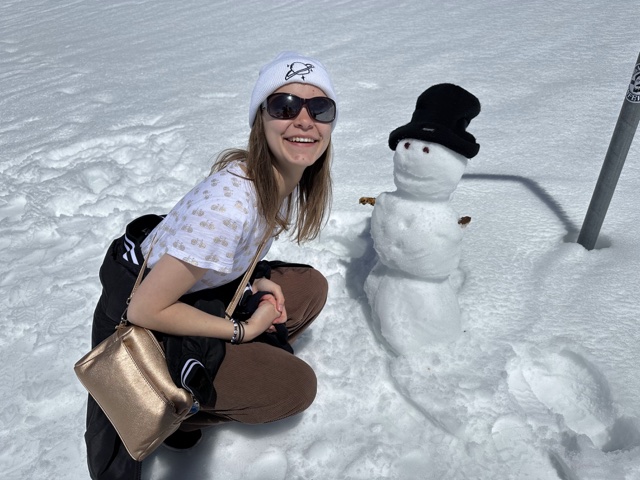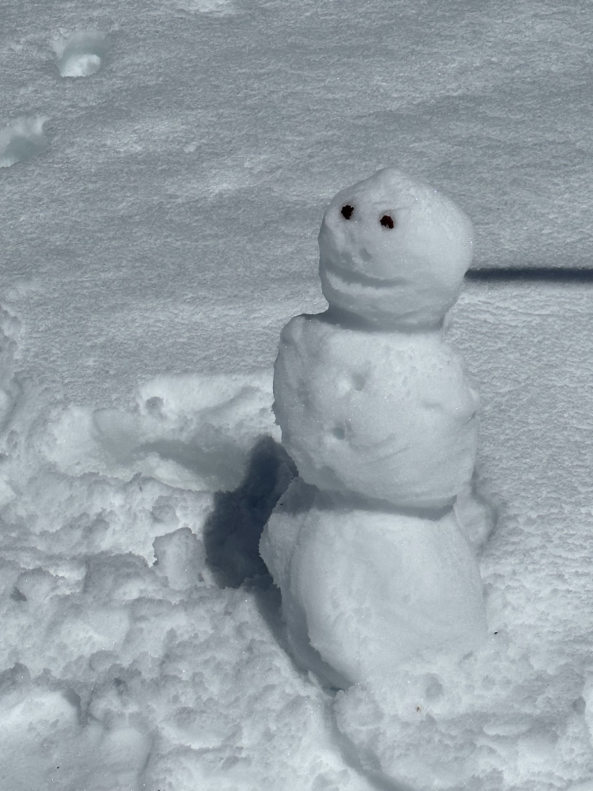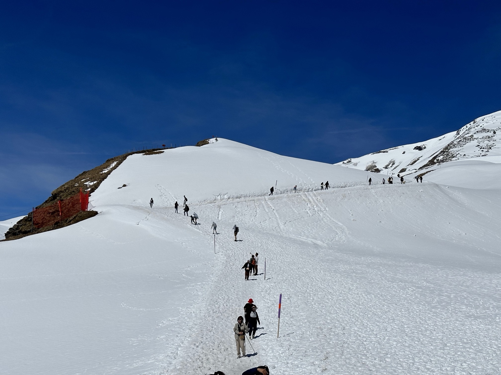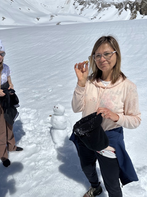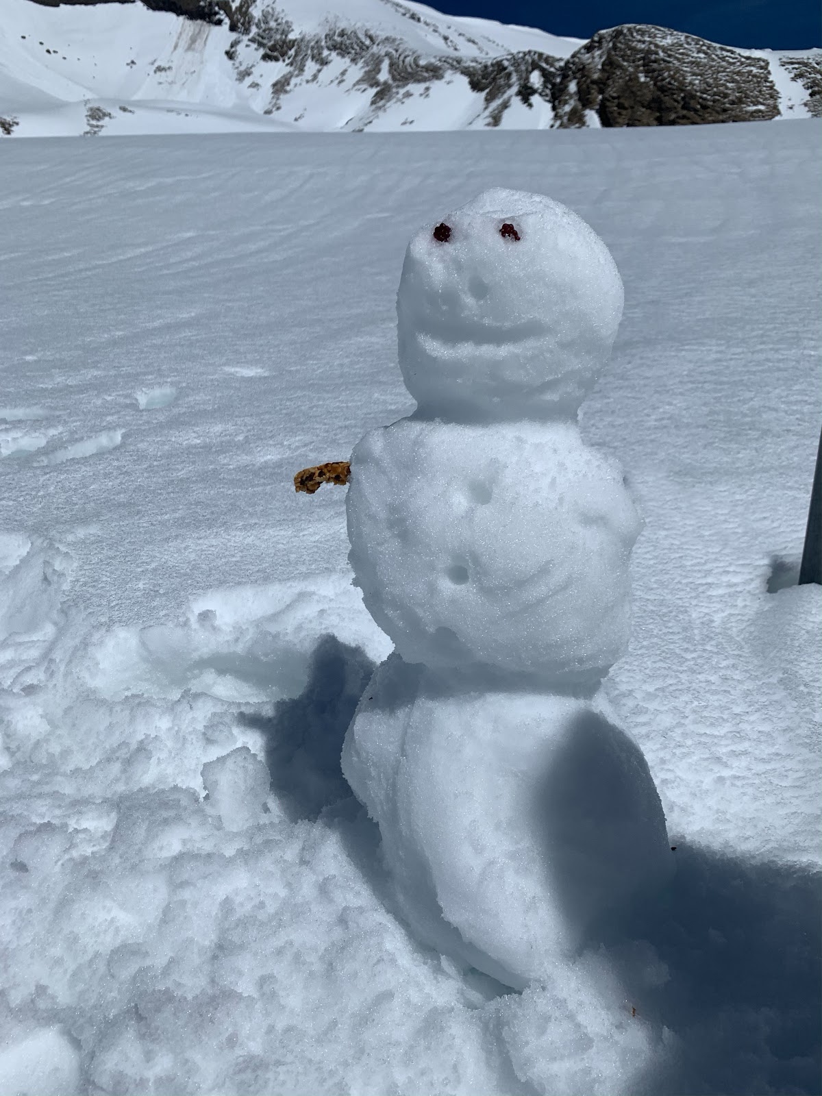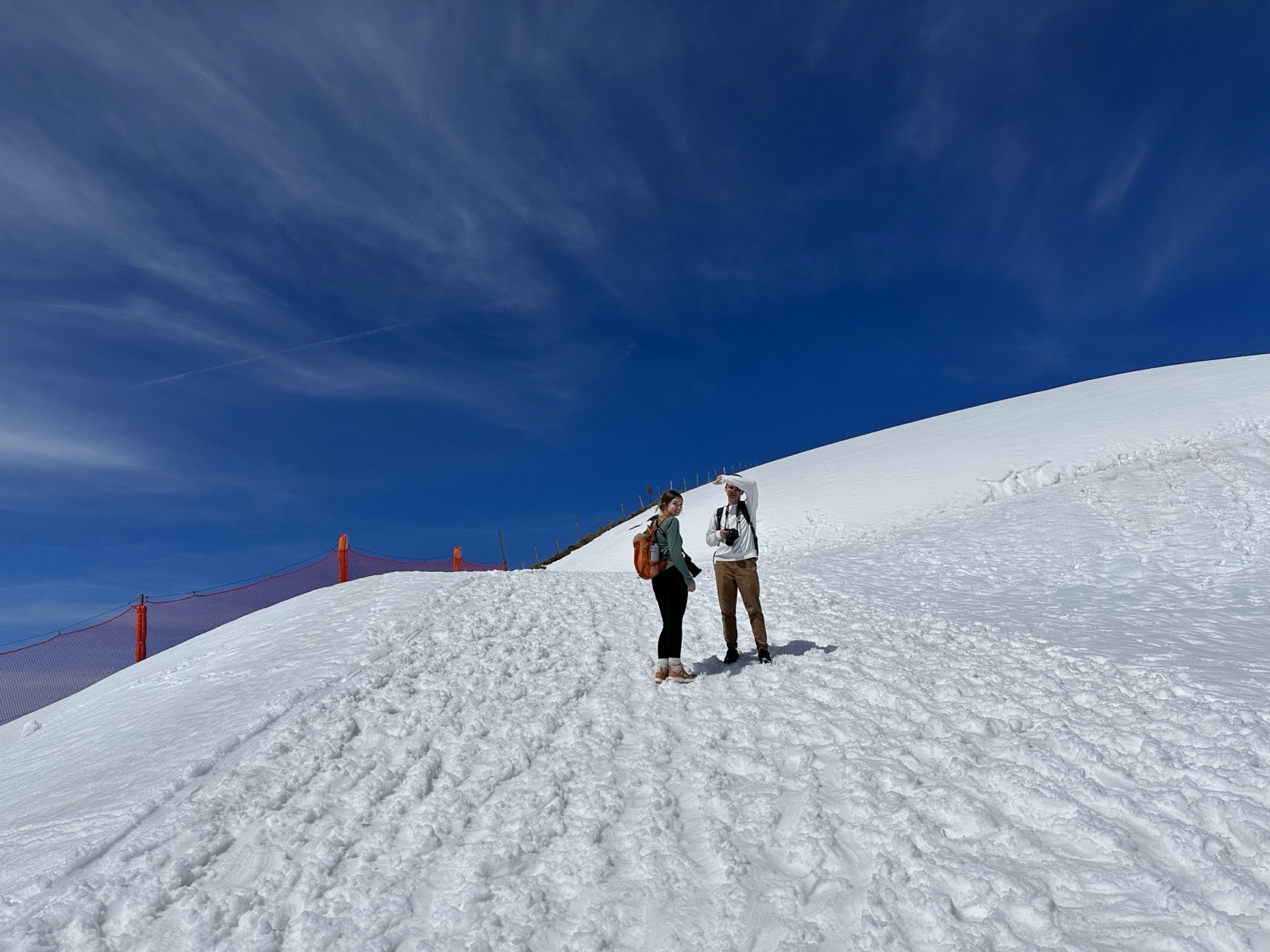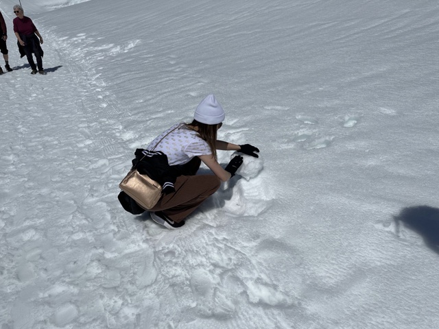When we got off the gondola, we found ourselves walking through slushy snow. (A snowball appears to be in play.)