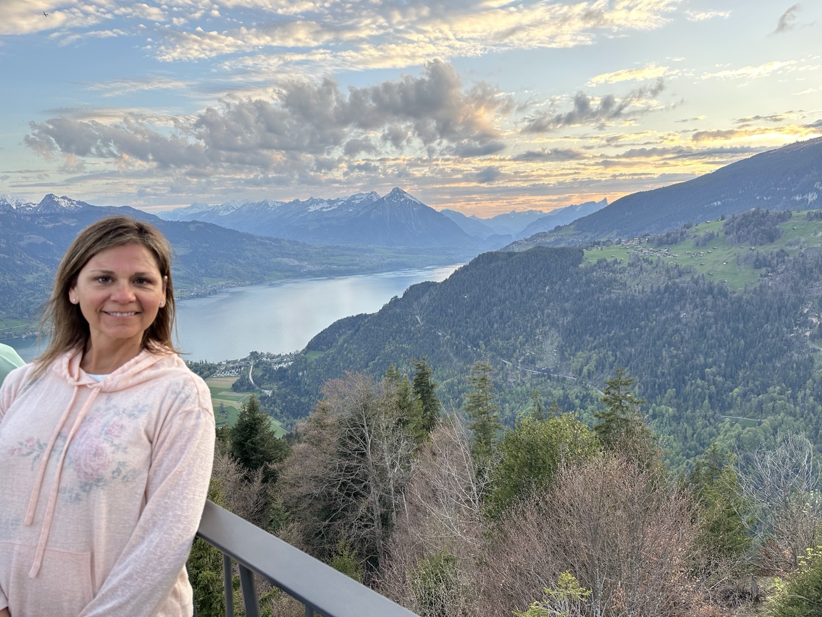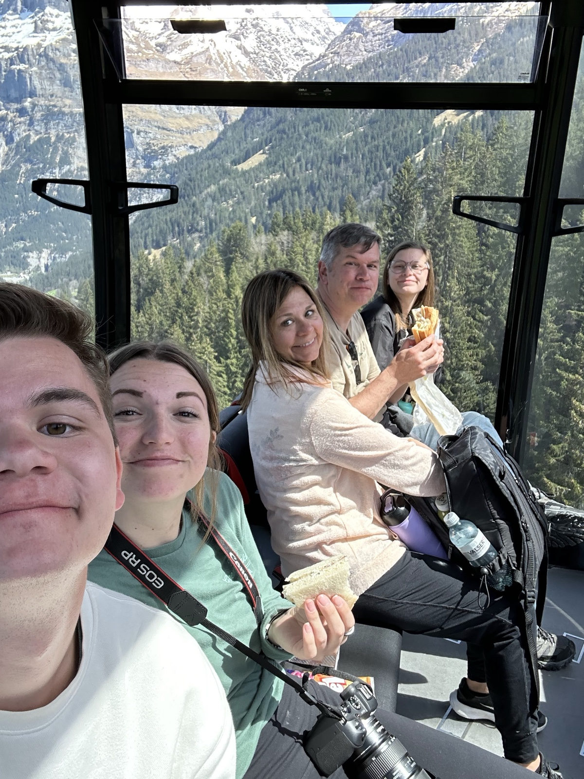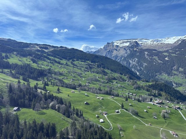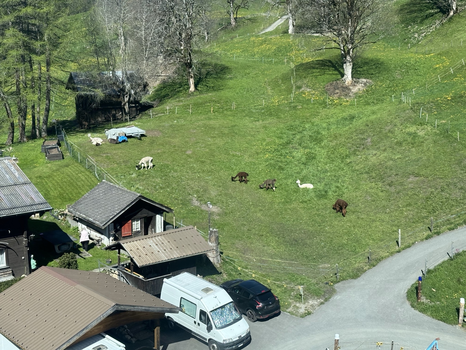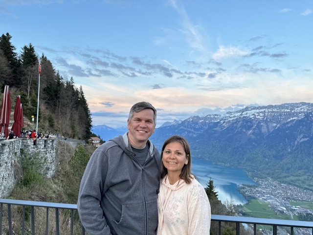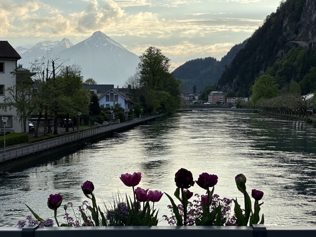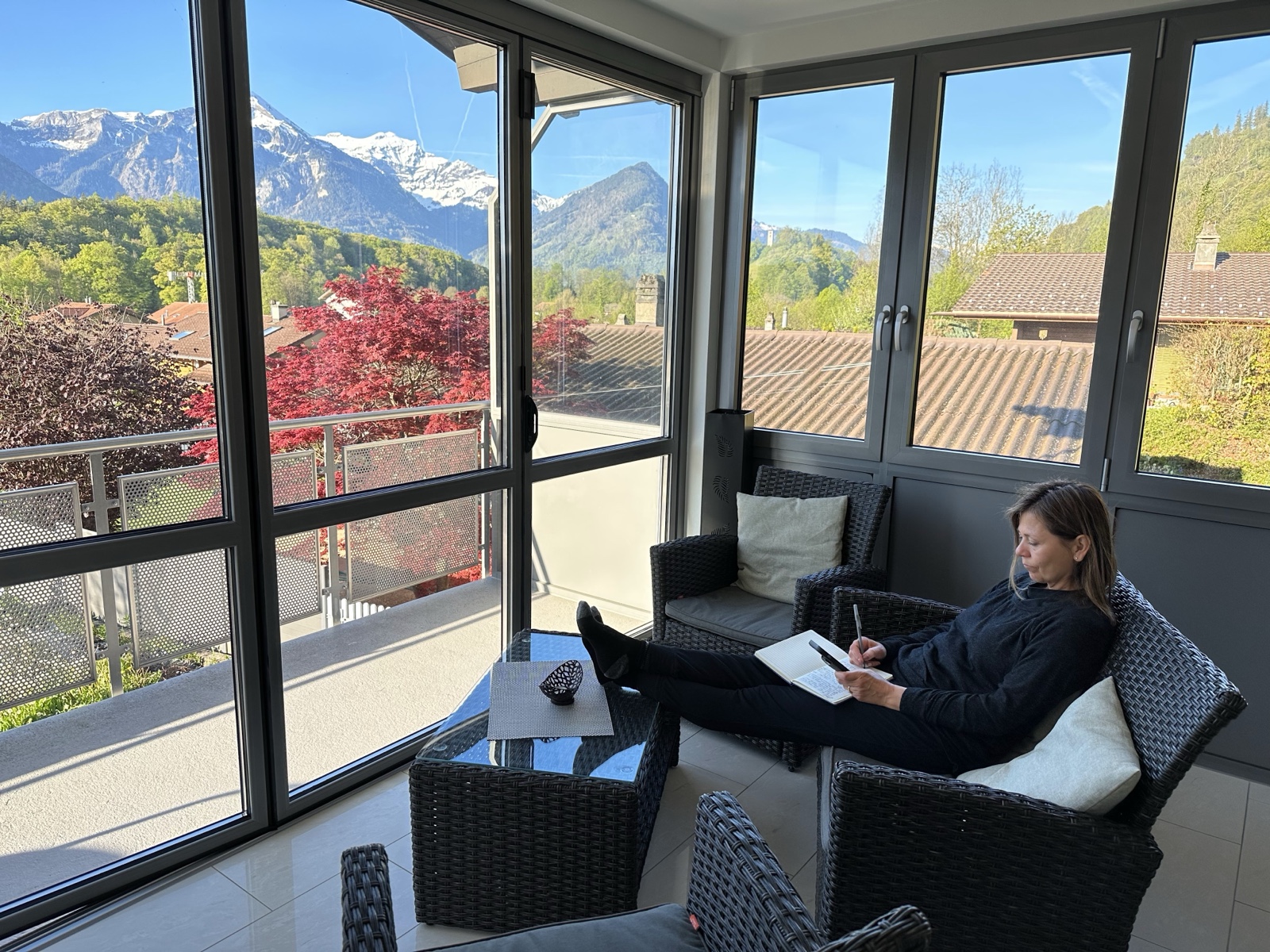 On May 4, 2023, we awoke at our AirBnB in Ringgenberg, near Interlaken. Linette found a pretty nice spot to "gazeeb" (read scriptures in the morning, as one might do in a gazebo). There were windows surrounding the sitting room, with views of the mountains all around.