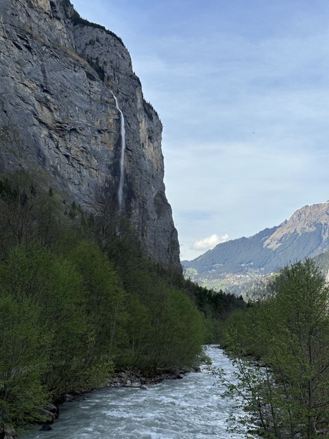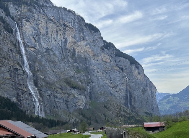 Here's a 48-second video showing two paragliders coming in for a landing; Sienna doing a little impromptu Irish dancing; the little creek; and Mürrenbach falls.
