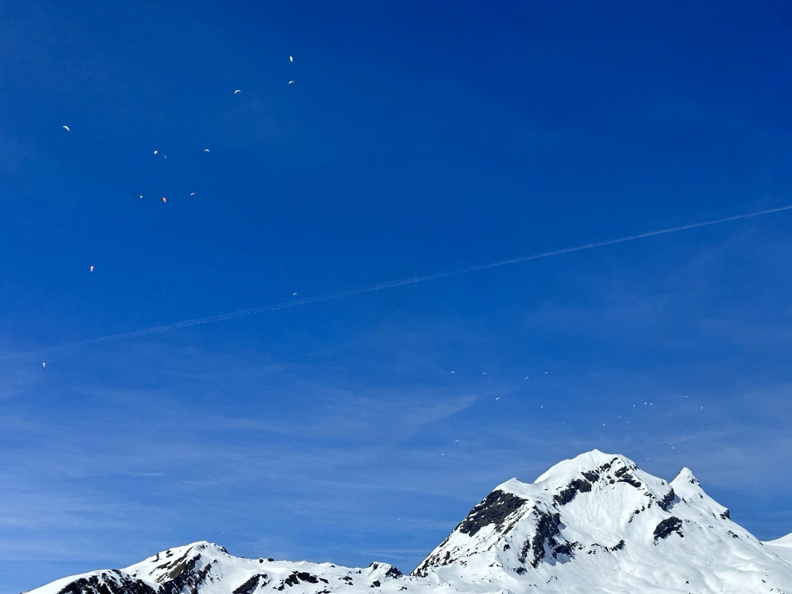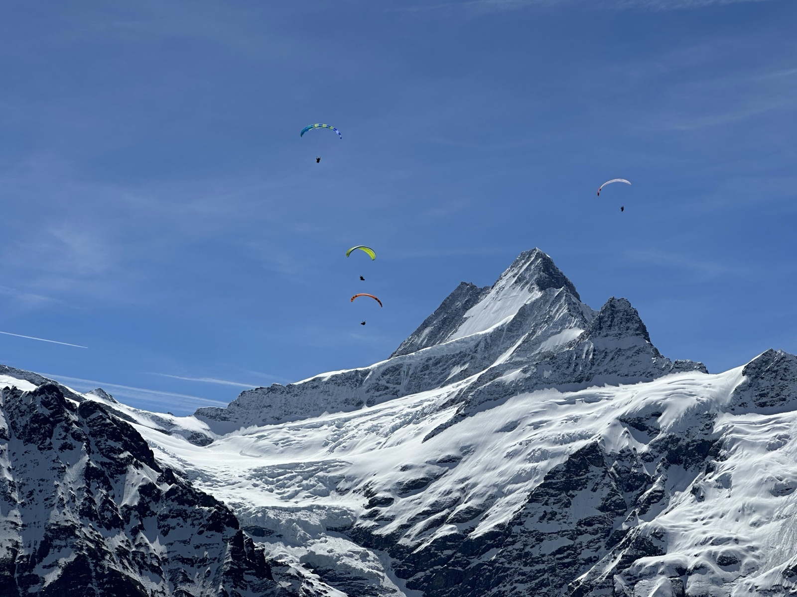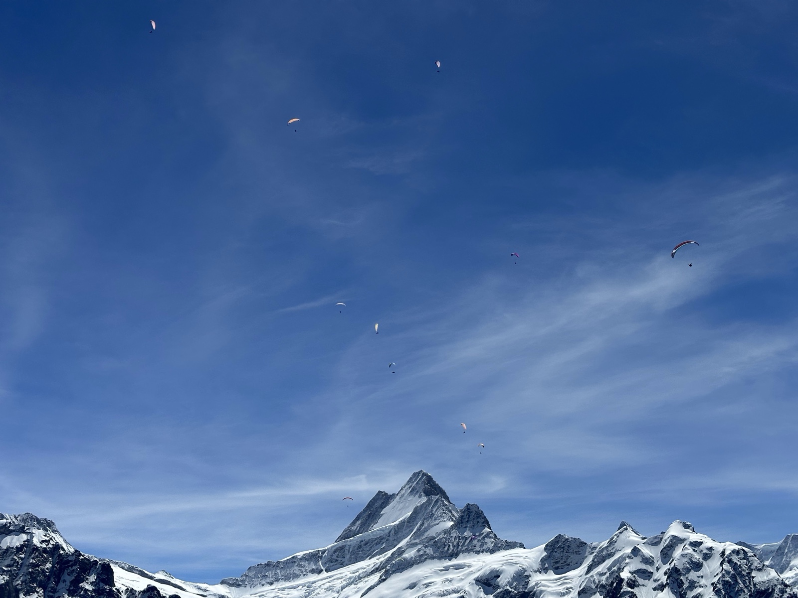 We saw some paragliders taking off from the snowy hill, and then soar into the sky from the updrafts.
