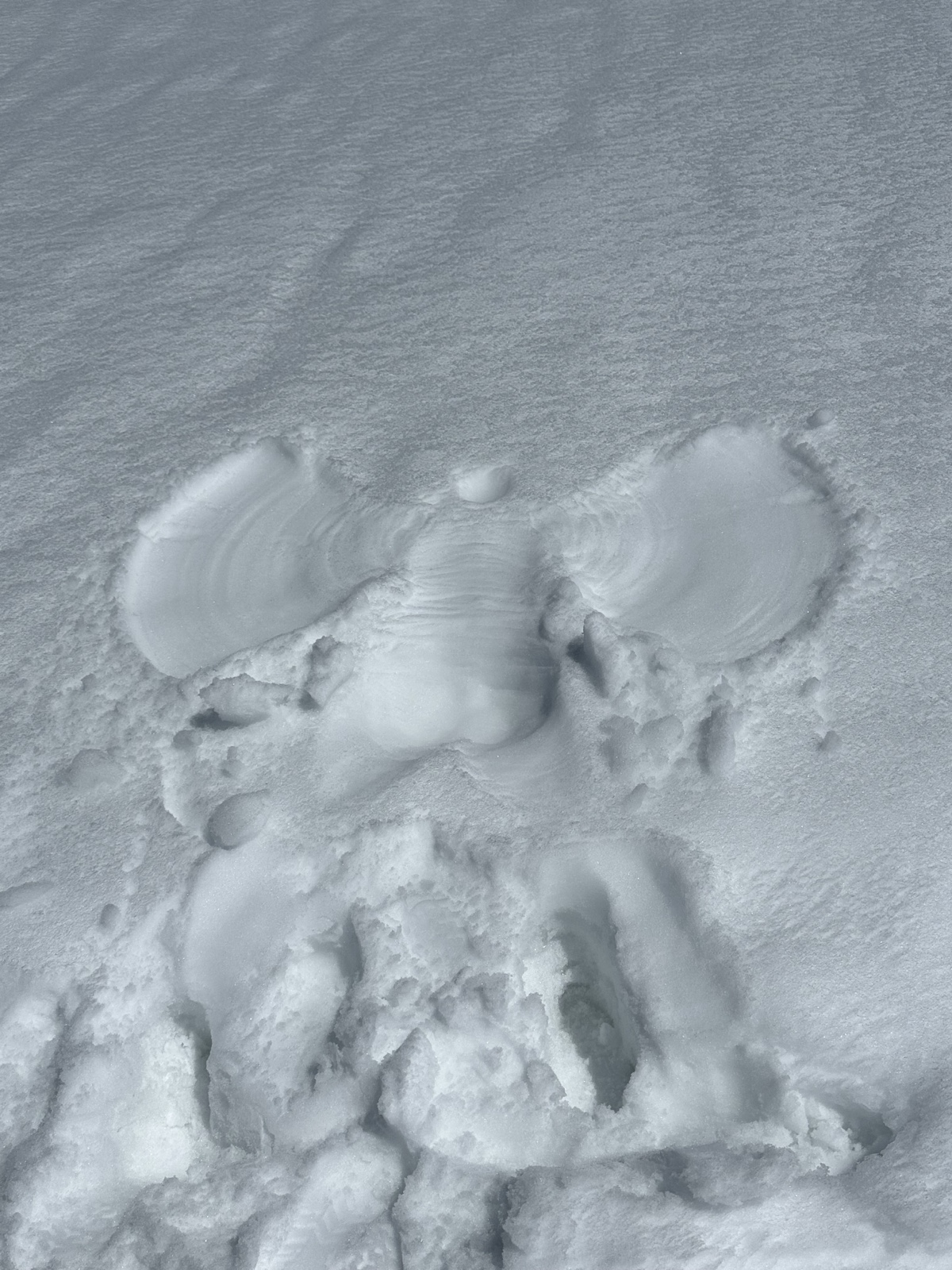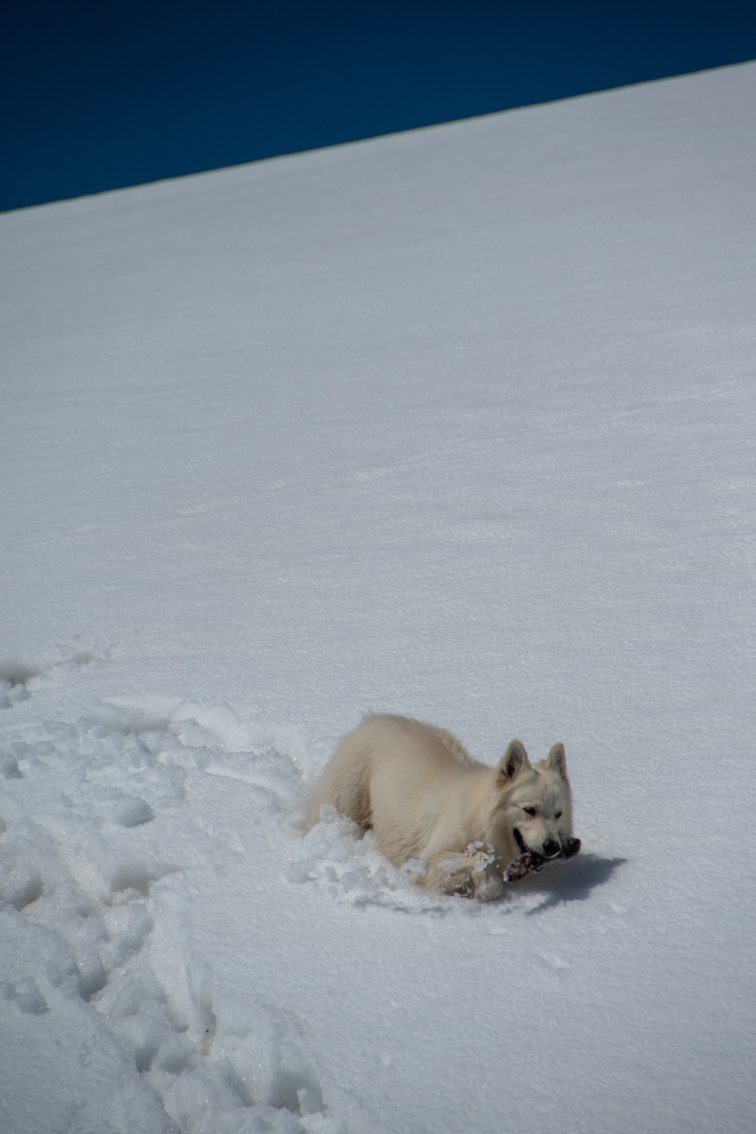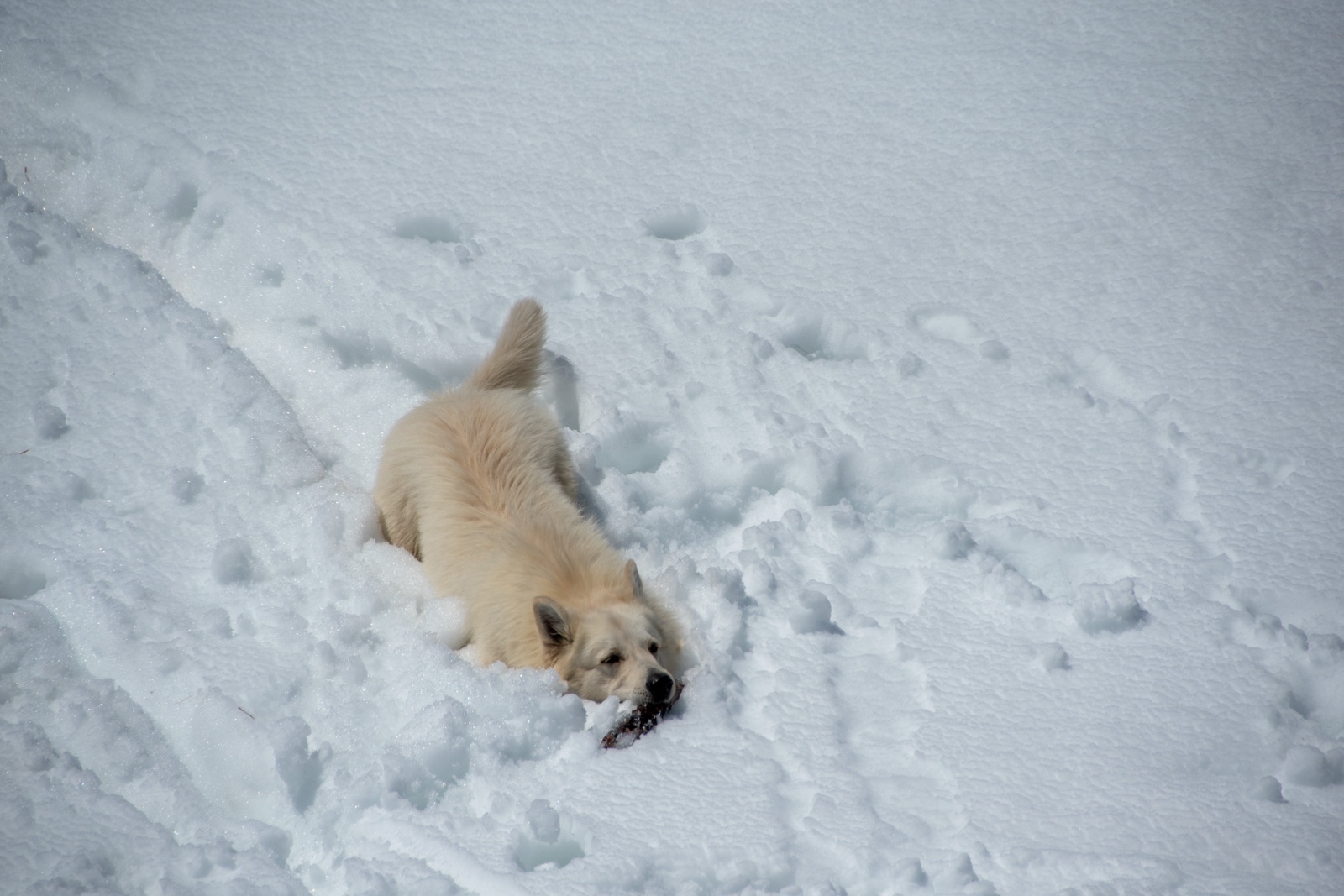 Someone had a white dog and threw a stick up onto the hill. It hade so much fun running into the snow to get it!
