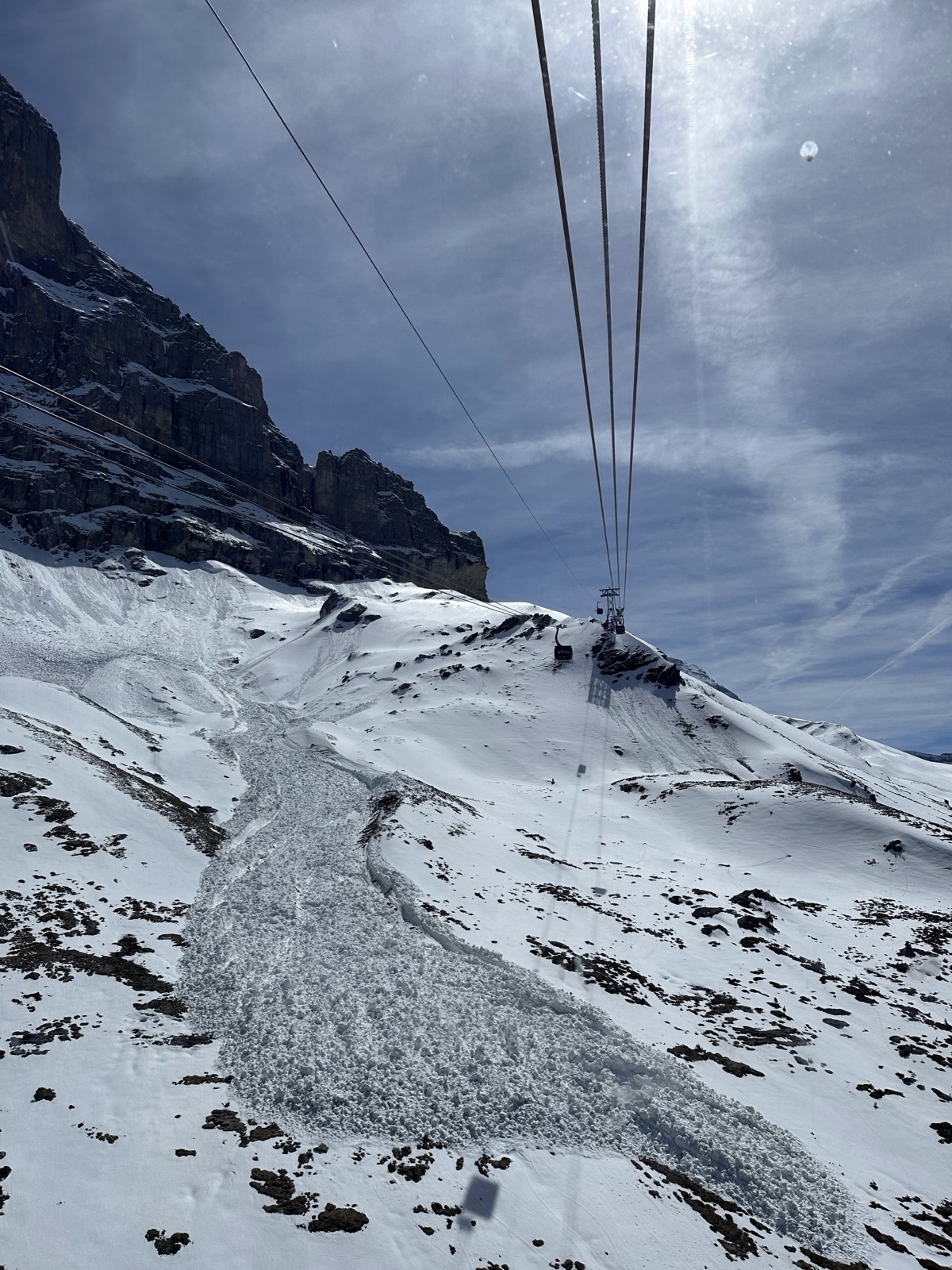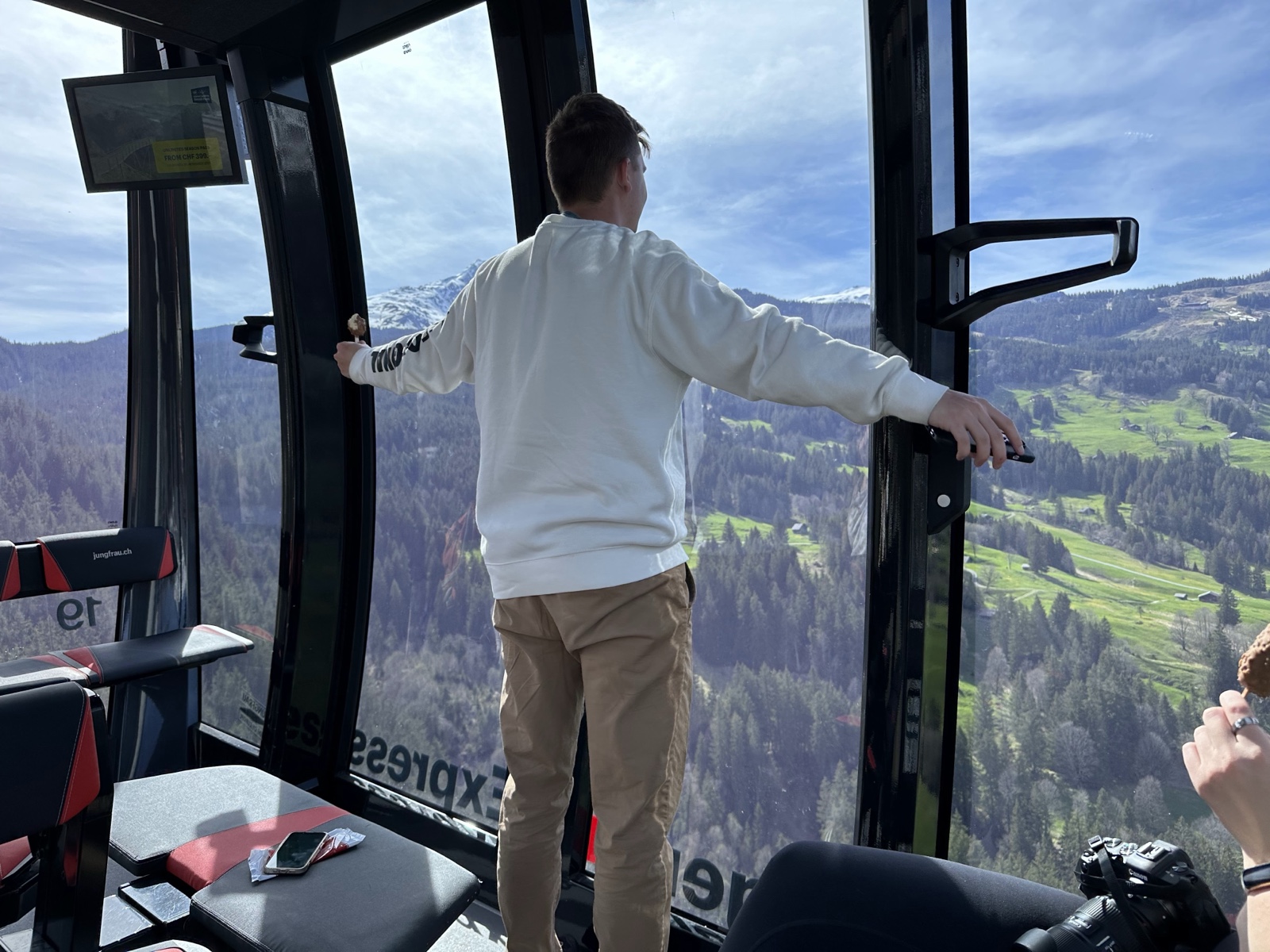 In this 1-minute video, you can see how the tram launches kind of quickly as it grabs on to the moving cable. Then the kids simulate "Soarin' over Switzerland". Finally, there is a time lapse video of the trip up, to the tune of "Summer" by Vivaldi.