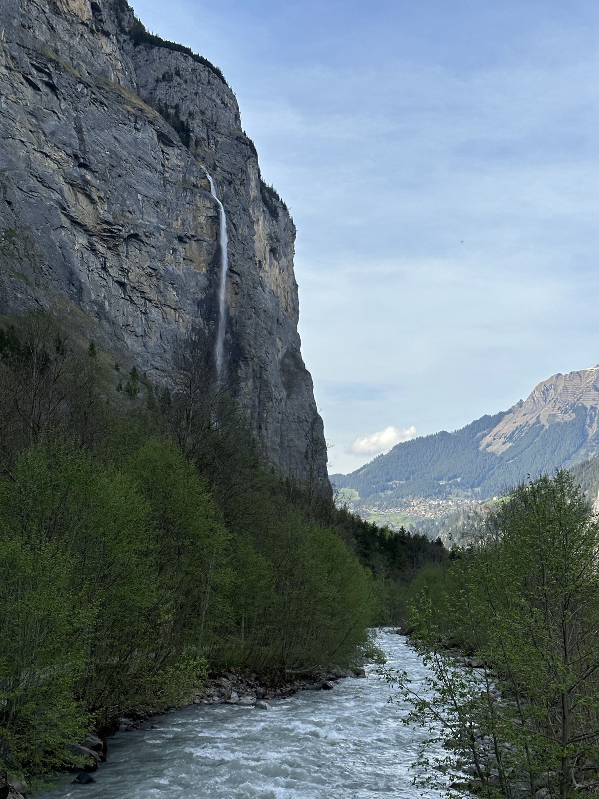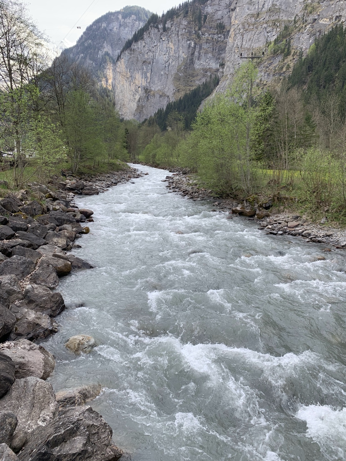 We drove down to a big parking lot by a waterfall. We walked over a bridge to cross the Weisse Lütschine River.