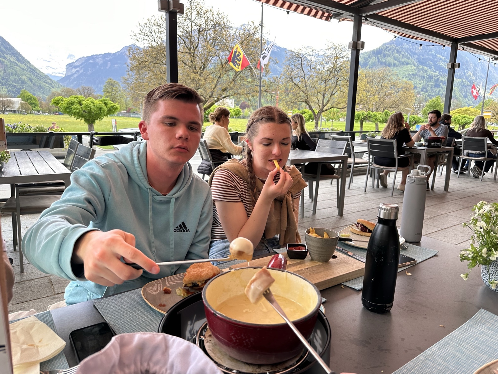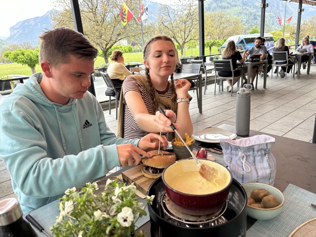 Back in Interlaken, we needed some lunch, and decided to try fondue, since that is such a big deal in Switzerland. They gave us a heated pot of cheese, a bowl of potatoes, and a bag of bread chunks.