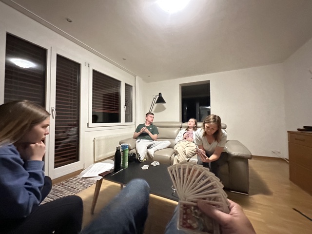 Since we got home at a reasonable time that night, we had time to play some games instead of just falling over. Here we are in the middle of The Great Dalmuti.