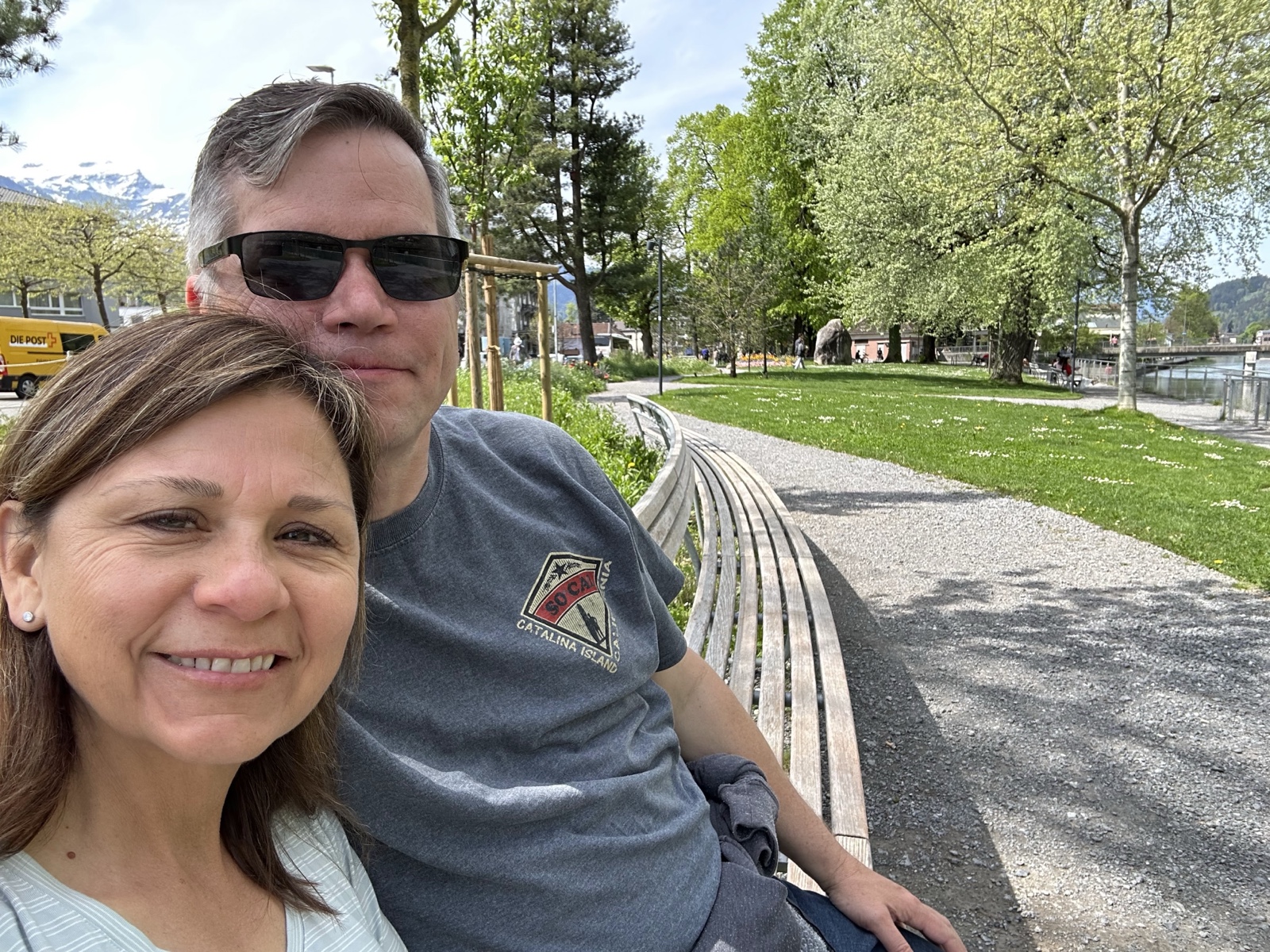 As we walked towards the train station, a bus happened by, so we jumped on that instead (also included in our pass). Once we found the boat terminal (Interlaken Ost, where "Ost" means "East"), we saw that we had a few minutes to wait, so we found a nice bench in the shade overlooking the river.