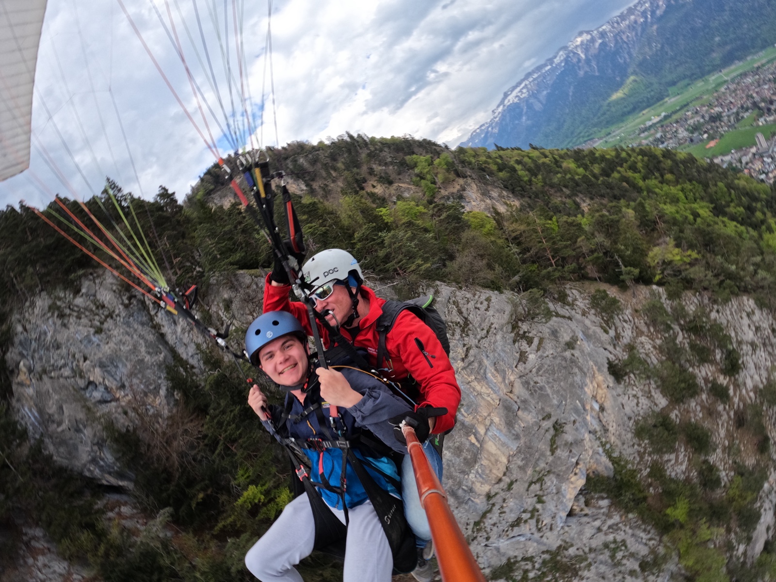 The idea is that you both get hooked to the chute, and then you run off this cliff.
