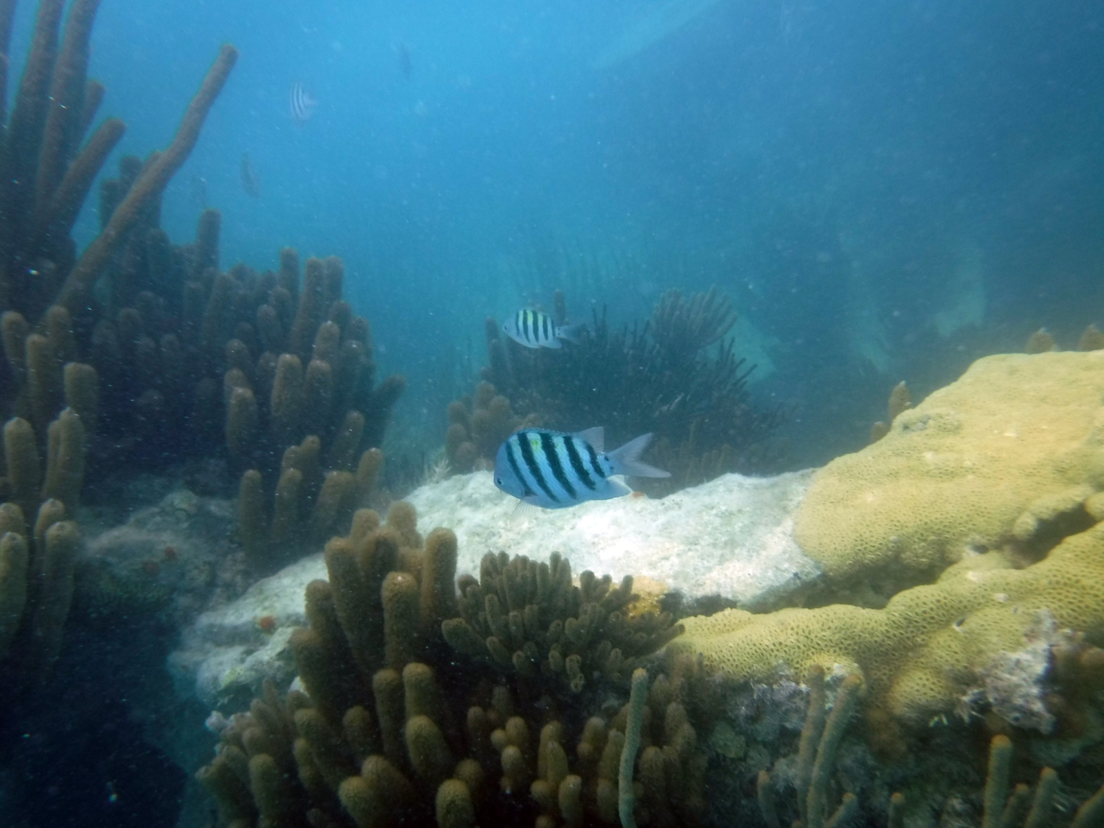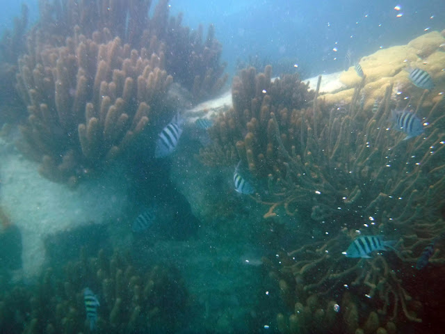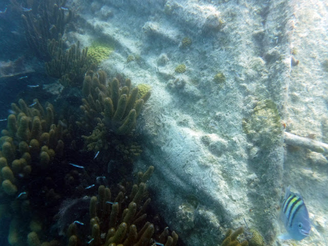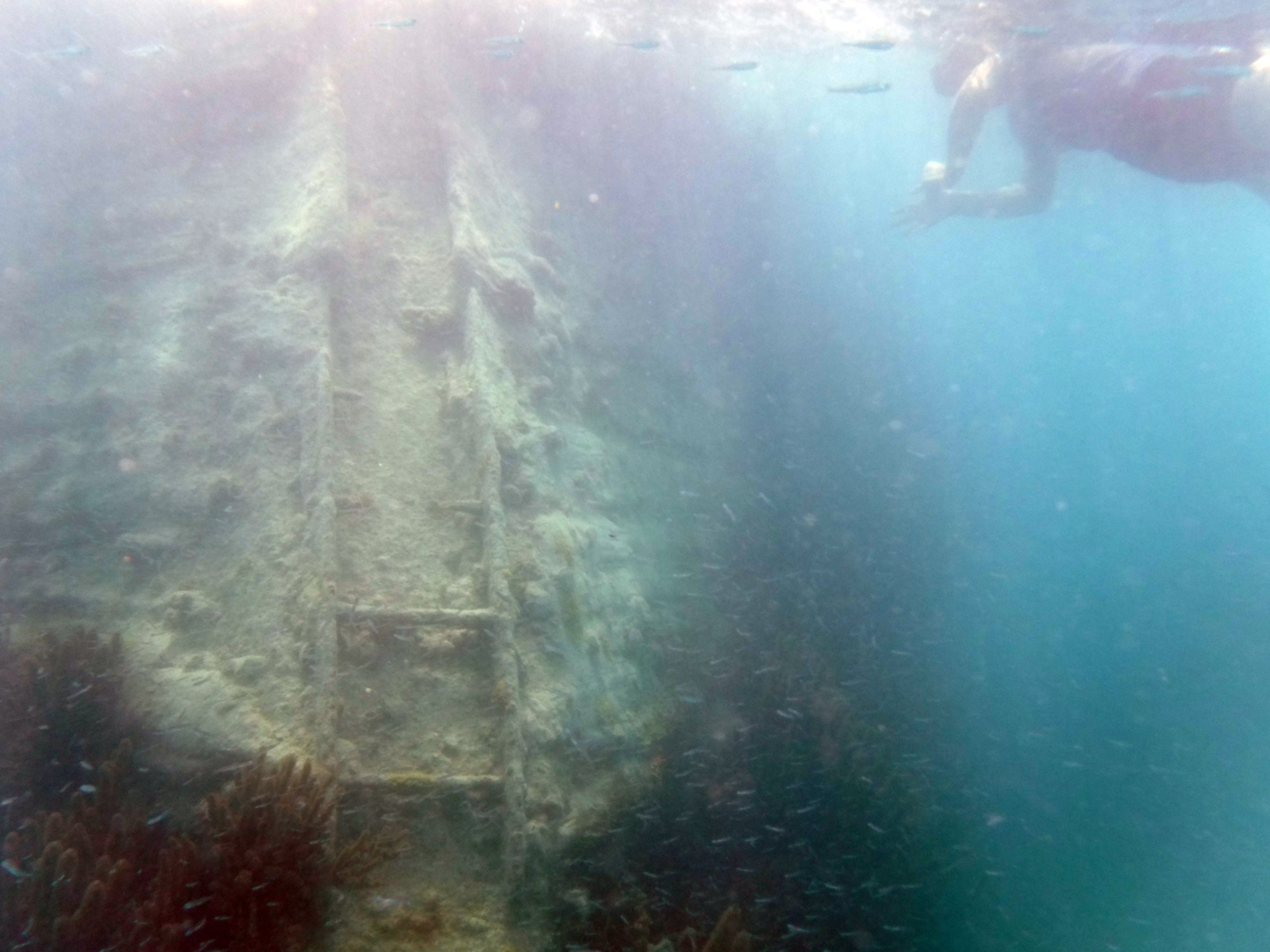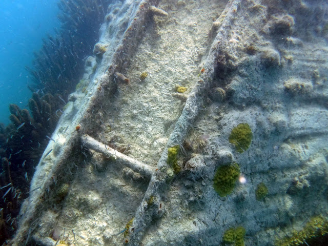 Here is a 4-minute video that shows the coral and fish around the shipwreck. The quality gets better during the footage from Katelyn's GoPro. Towards the end, you see Erika swim down to take a peek inside the gaping hole in the deck of the ship. Luckily, no sharks nor giant squids in there. (I added a little Enya music to avoid having to listen to distorted underwater sounds from the bad microphones.)