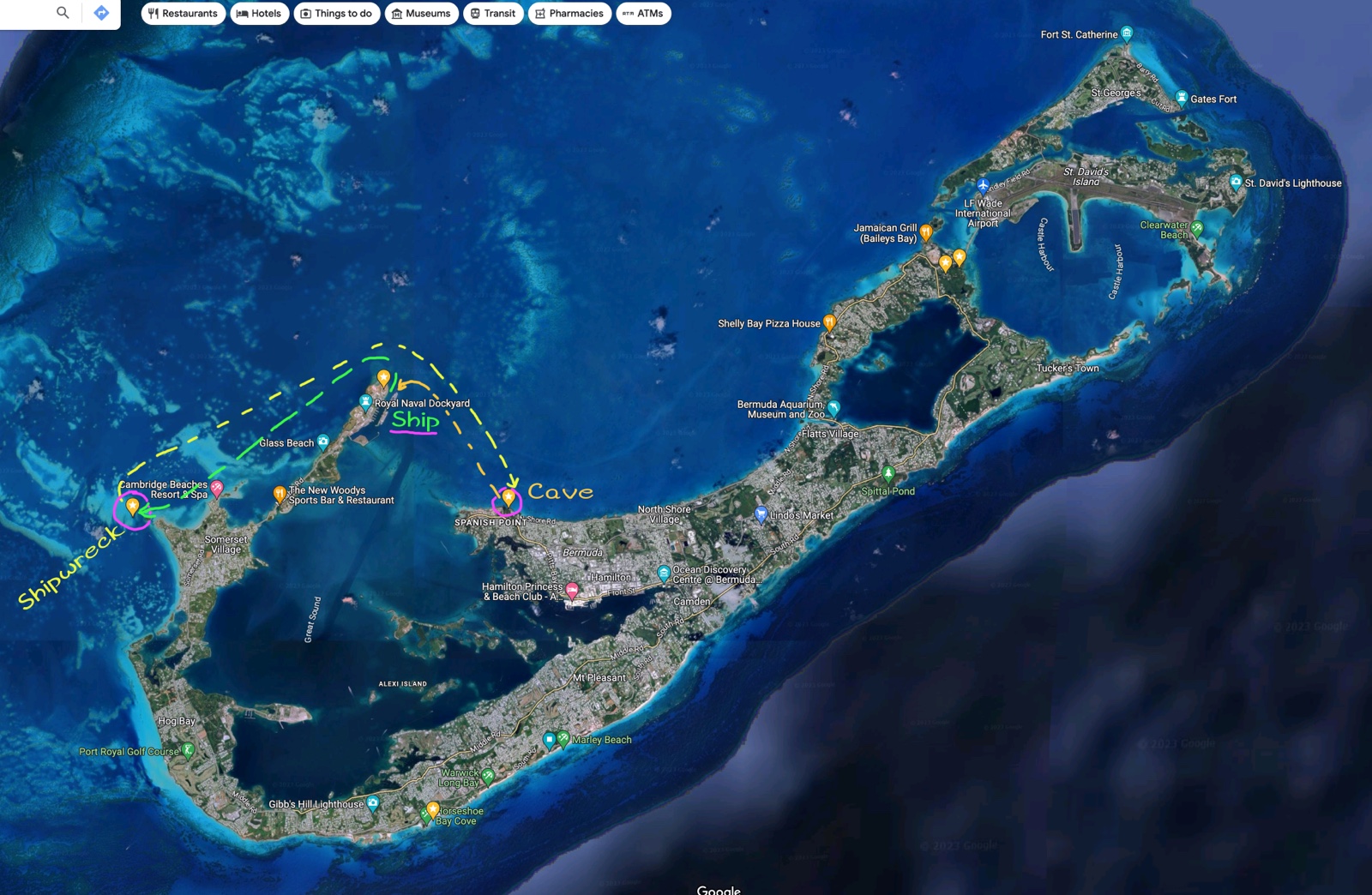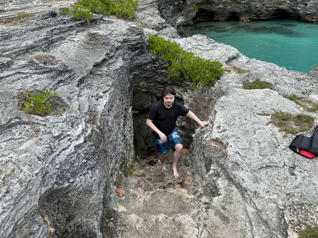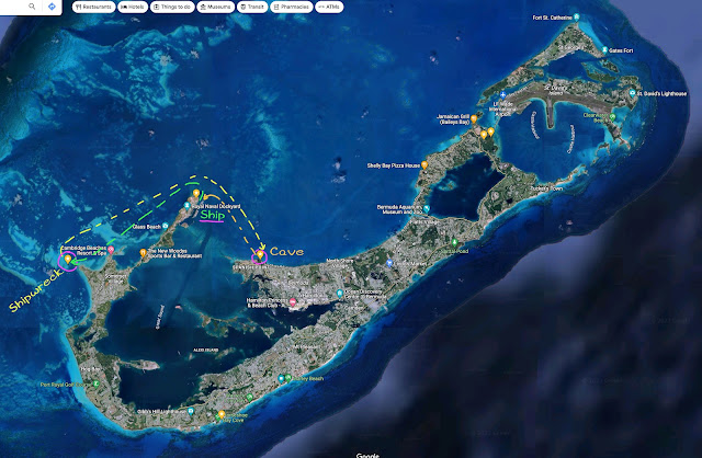 Here's a map of Bermuda. It is shaped like a fishhook. Our ship was at the Royal Dockyard at the northeastern tip of the "hook" shown as "Ship" in the middle of the left side. We went out to the "Shipwreck" at the upper left edge; and then back past our ship over to where it says "Cave" on the north shore, near the main city of Hamilton.