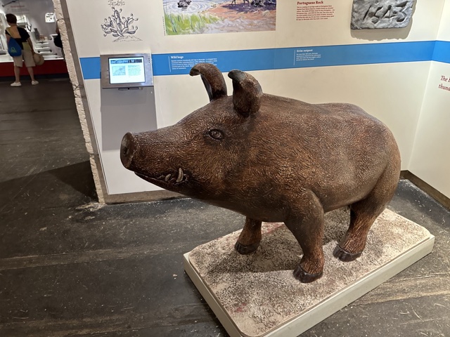 One funny display said that in order to create a ready source of food for future castaways, "Spanish mariners intentionally left hogs on Bermuda--or dropped them overboard within swimming distance while sailing by." We all laughed at the image of throwing pigs overboard and hoping they could swim to shore.