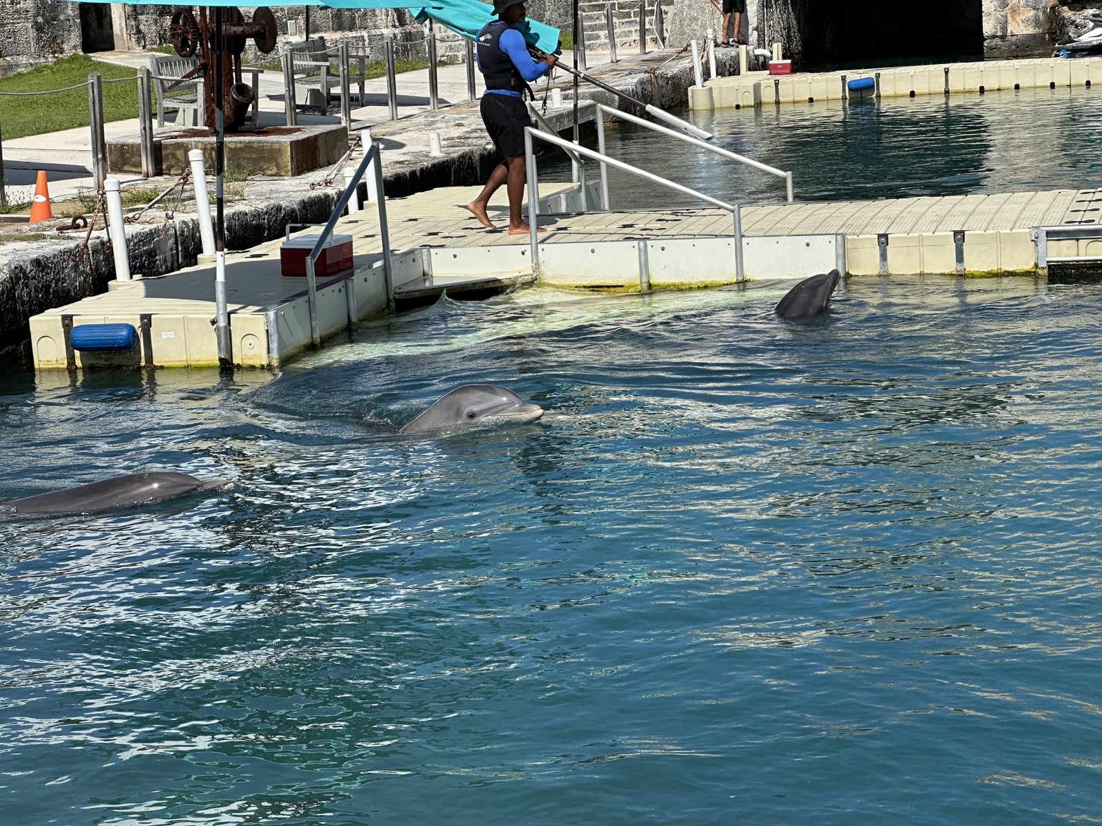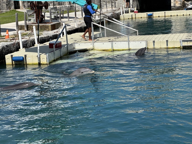 Next to that building was a tank where dolphins were trained. Linette and some others sat to watch some tourists interact with the dolphins.