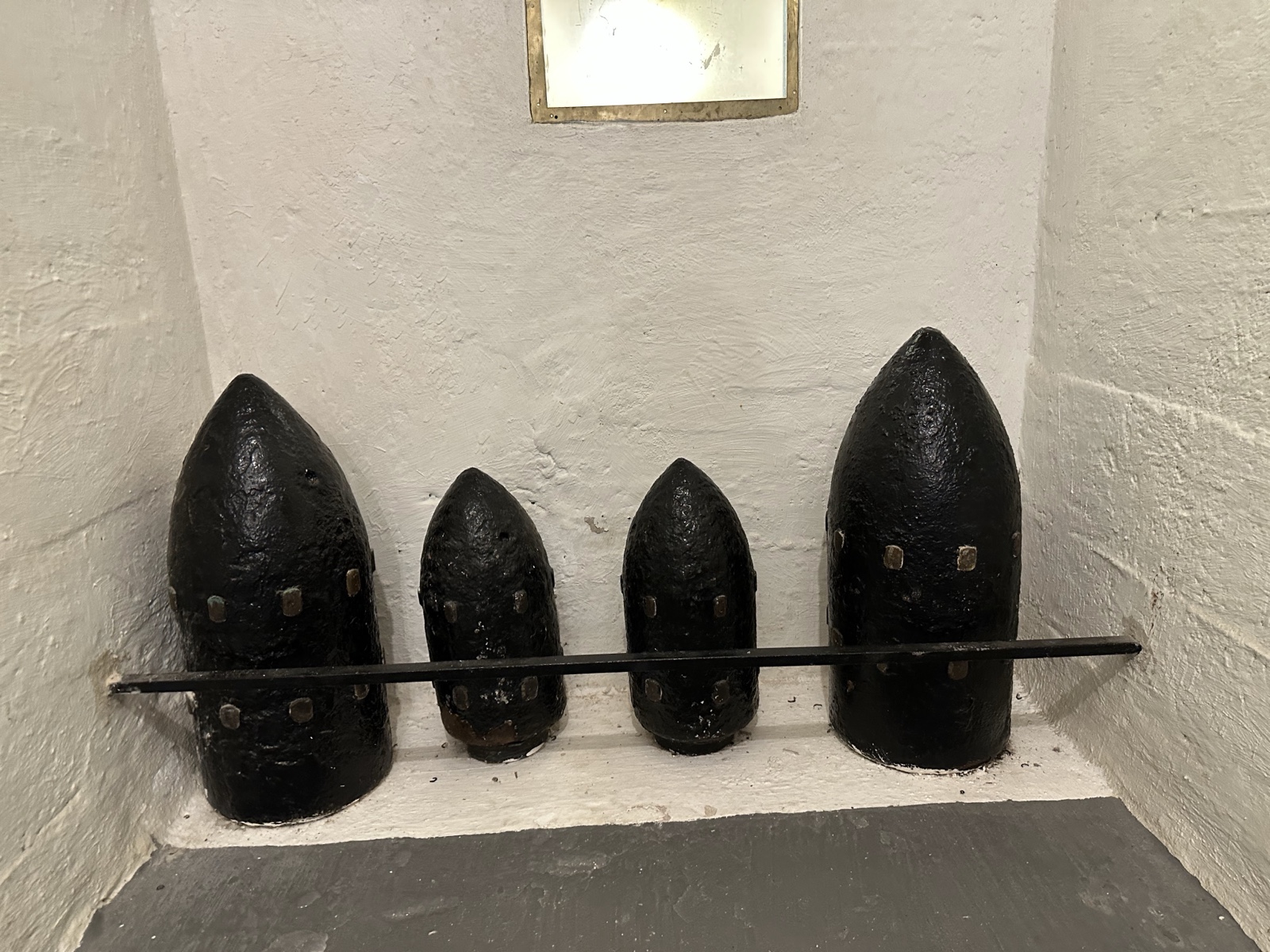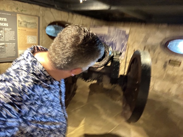 Other displays in the building showed various cannons and shells. I learned that a "gun" fires horizontally to try to punch a hole in the side of a ship; a "mortar" fires high so that it can punch a hole in the top of a ship; and a "howitzer" is in between.