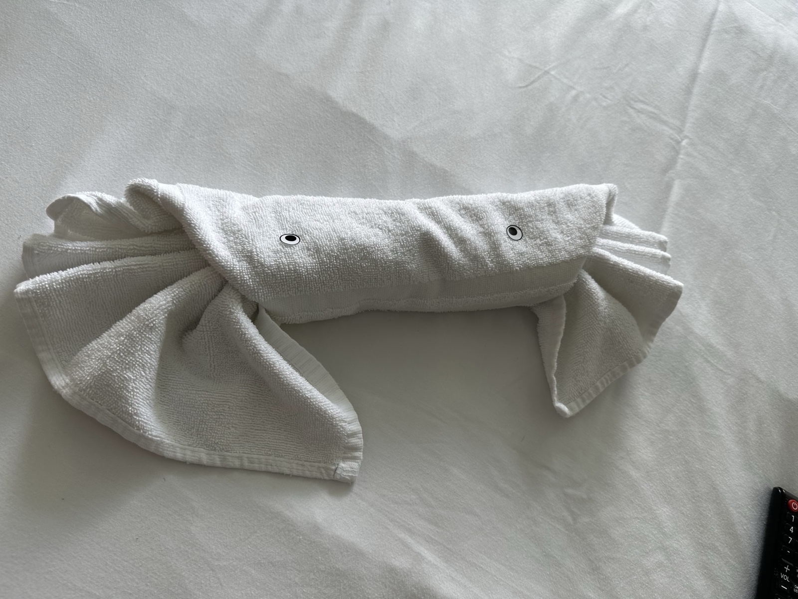 When we returned to our room, we found that they had made a towel like a little crab.