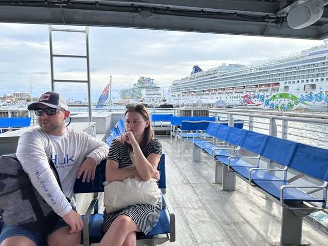 During dinner, the ship pulled away from the dock, and the land started getting smaller in the distance. I think we had to head east to get past the reefs before we could go west again, so we saw the island go by again a little later.