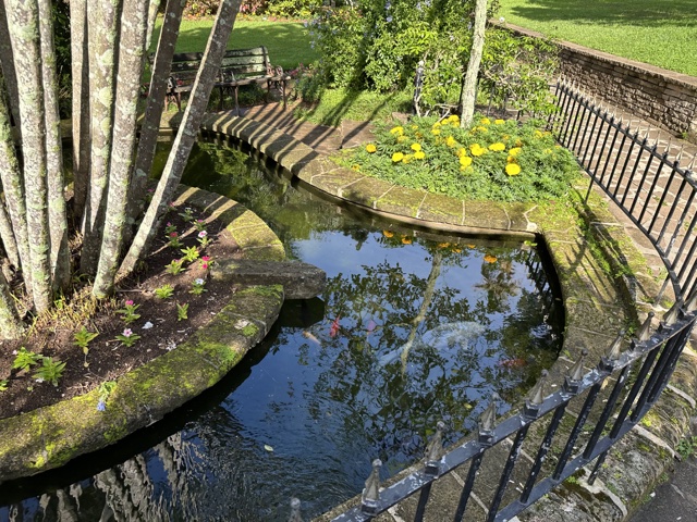 There were fish in the pond, and people hanging out there.