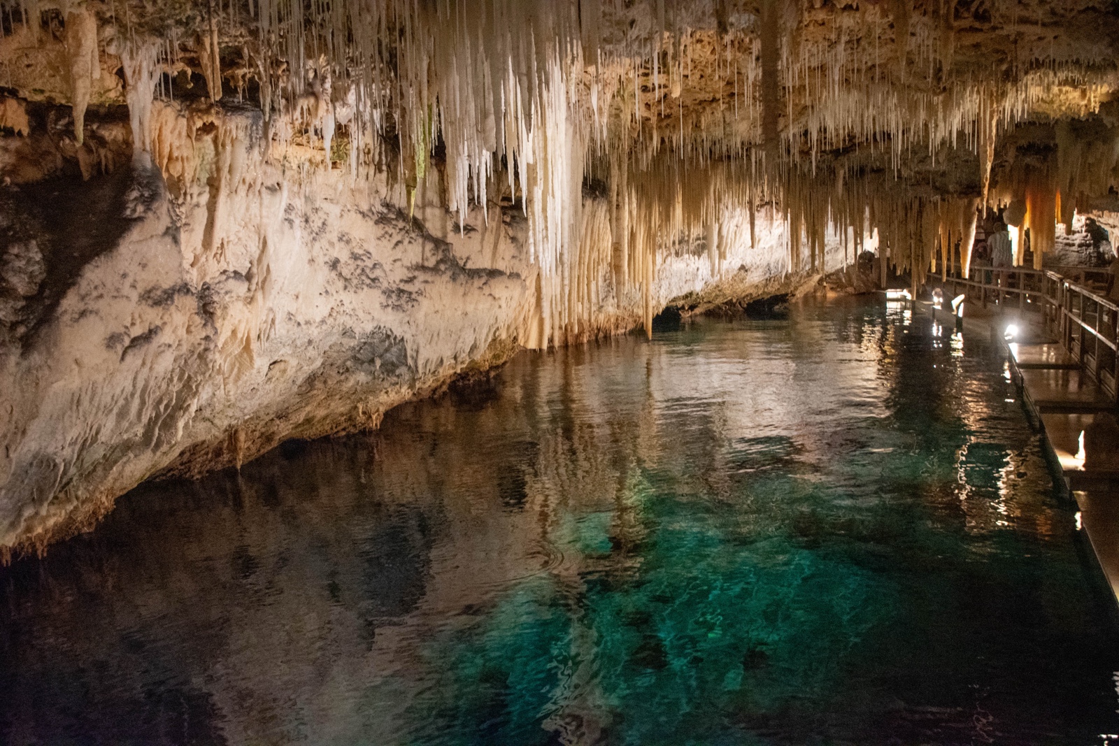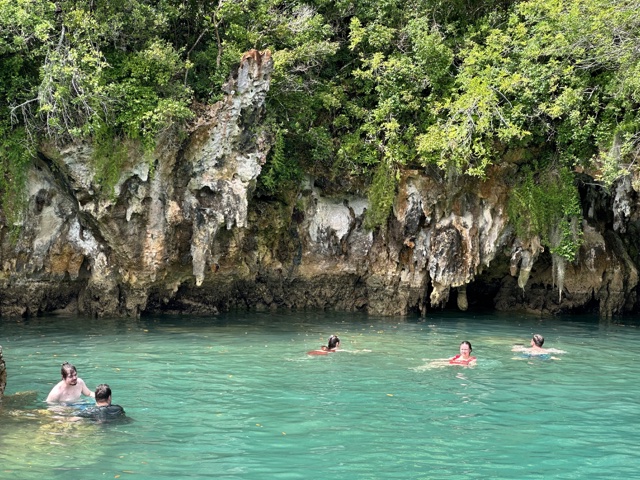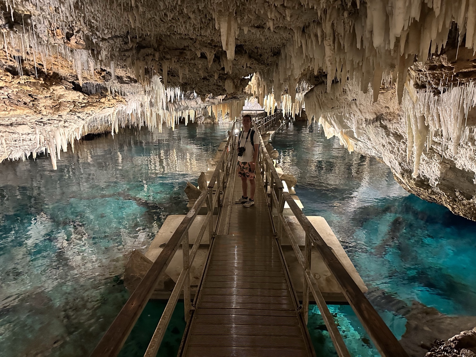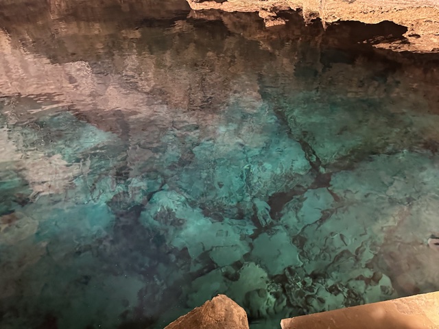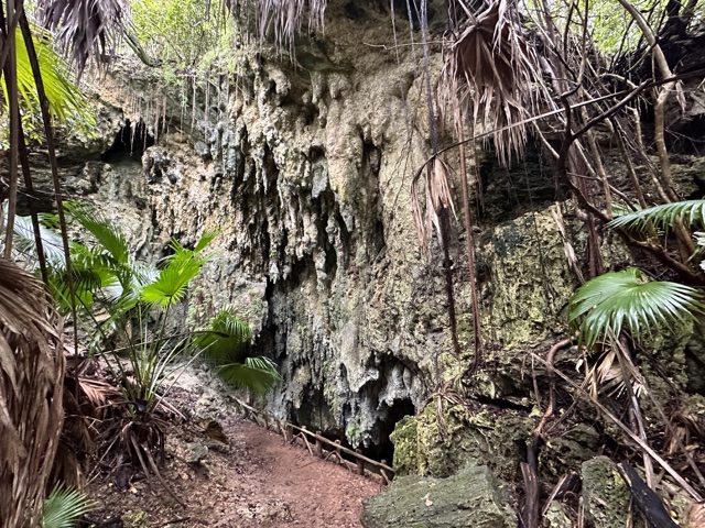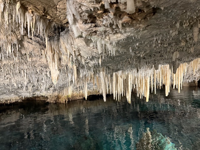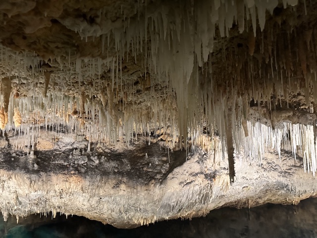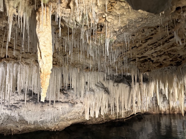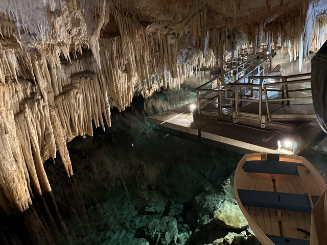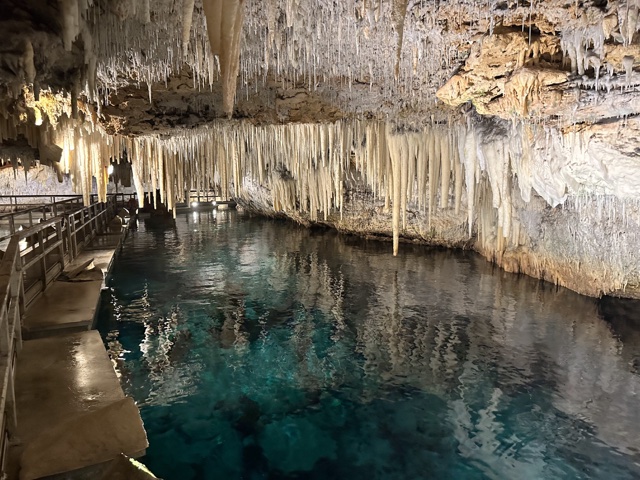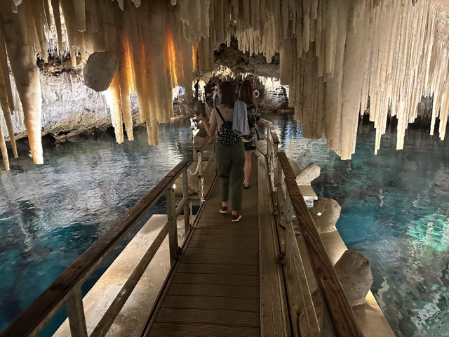 Tourists used to float on a little boat down the caves, which would be fun. But now there is a floating walkway. It has to be floating because the water rises and falls about 3 feet with the tides. The water here is connected to the Atlantic Ocean and is salty.