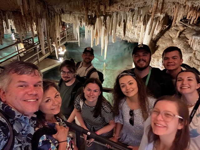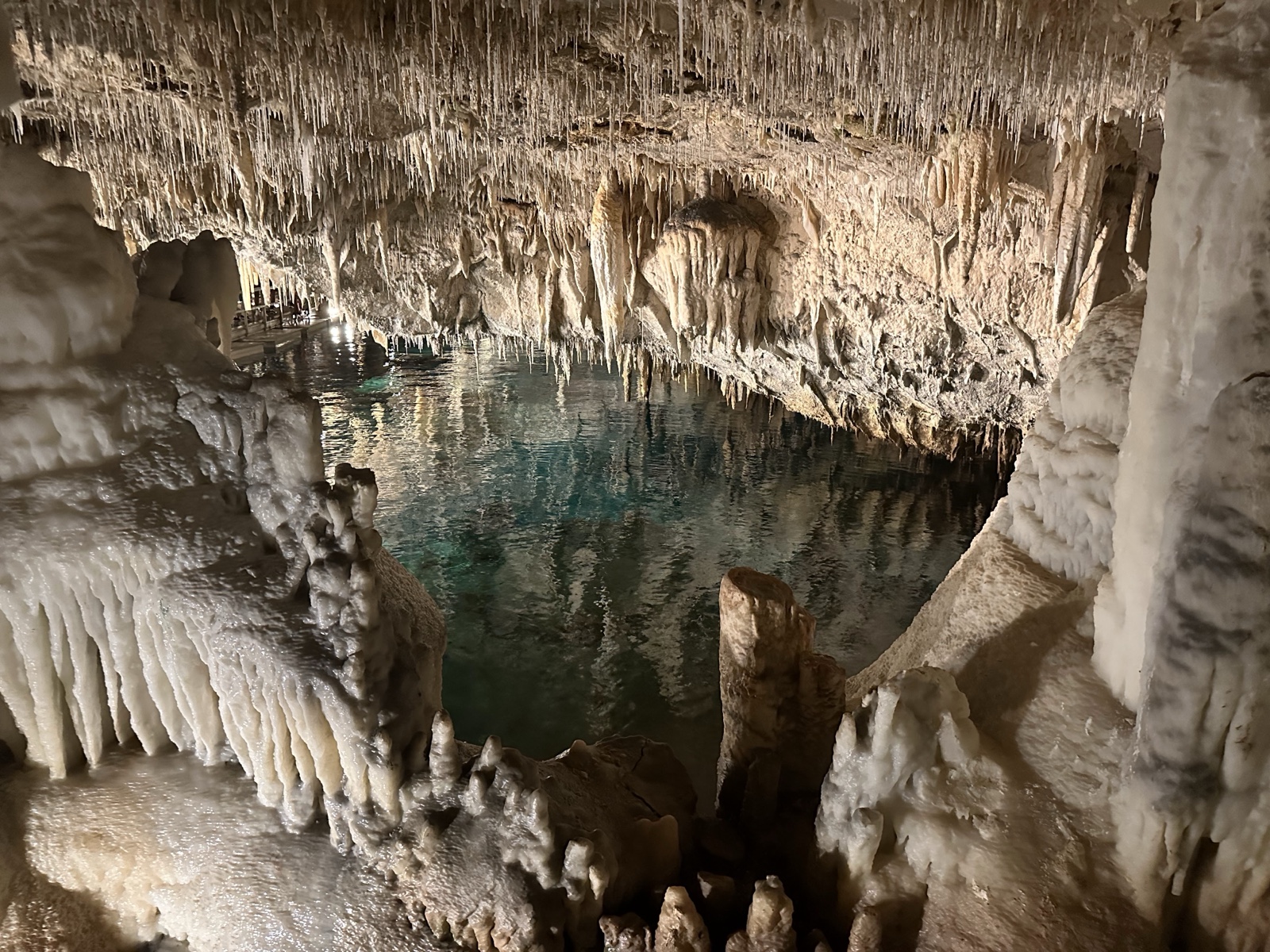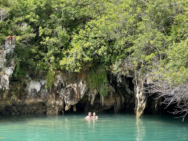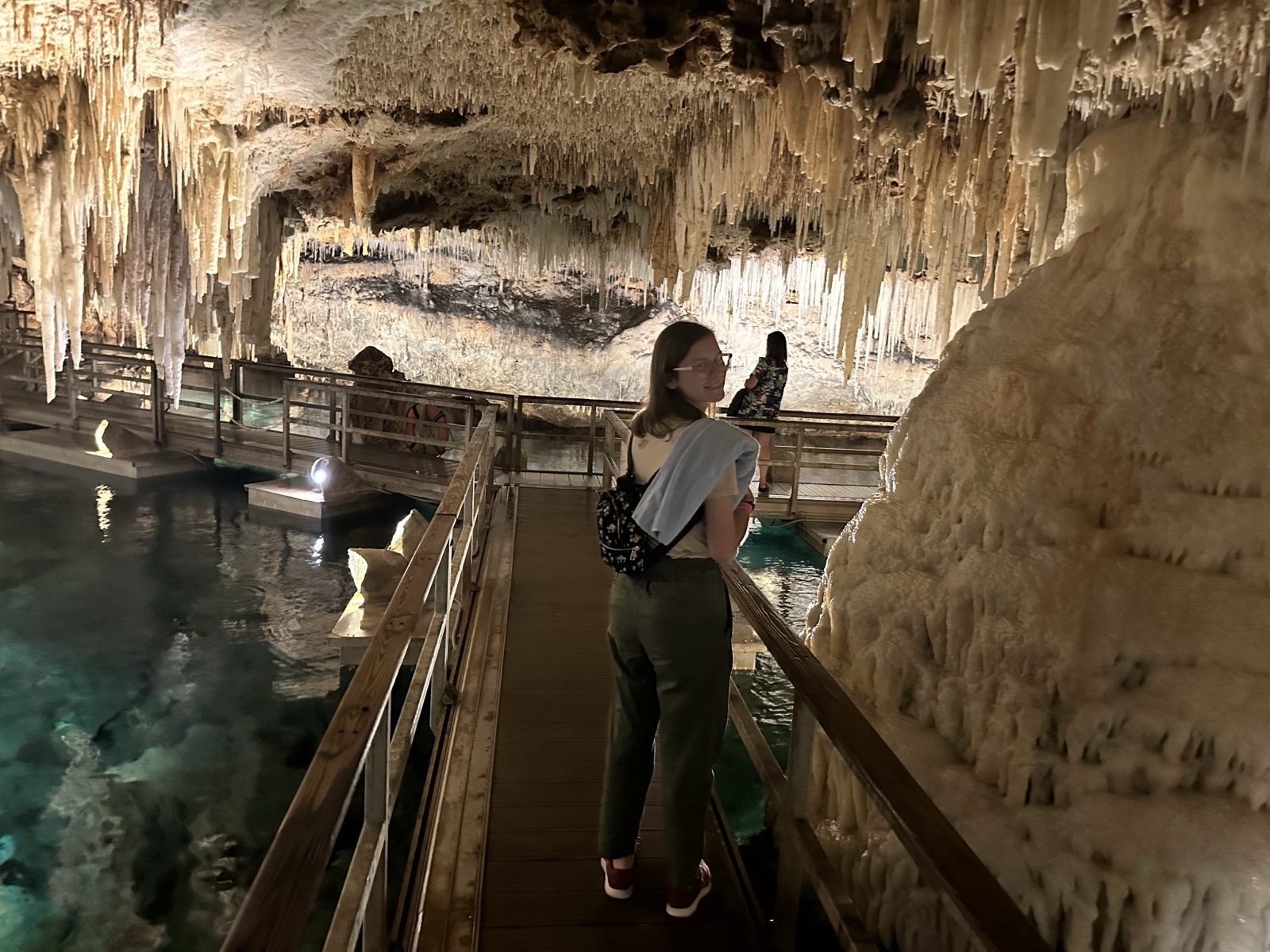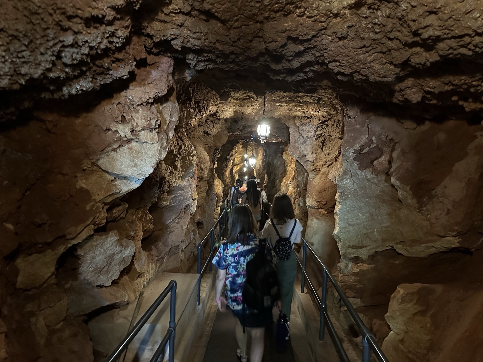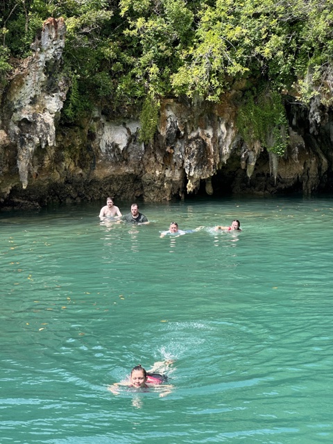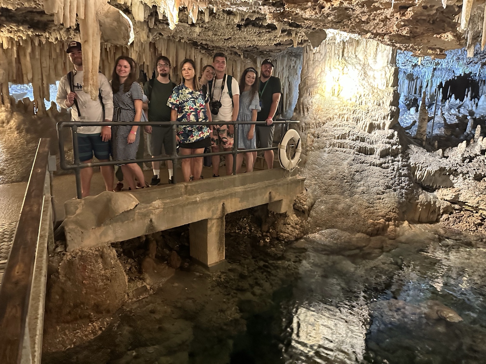 Tourists used to float on a little boat down the caves, which would be fun. But now there is a floating walkway. It has to be floating because the water rises and falls about 3 feet with the tides. The water here is connected to the Atlantic Ocean and is salty.