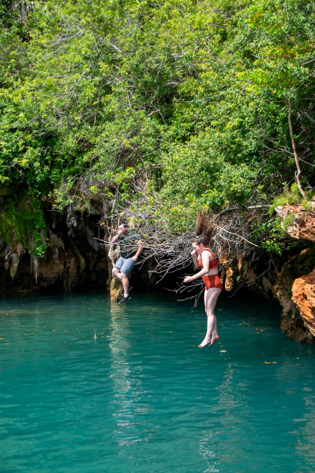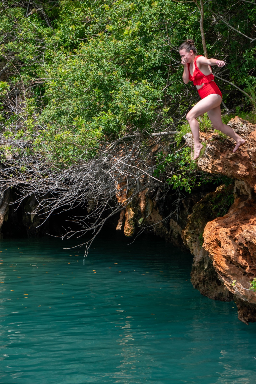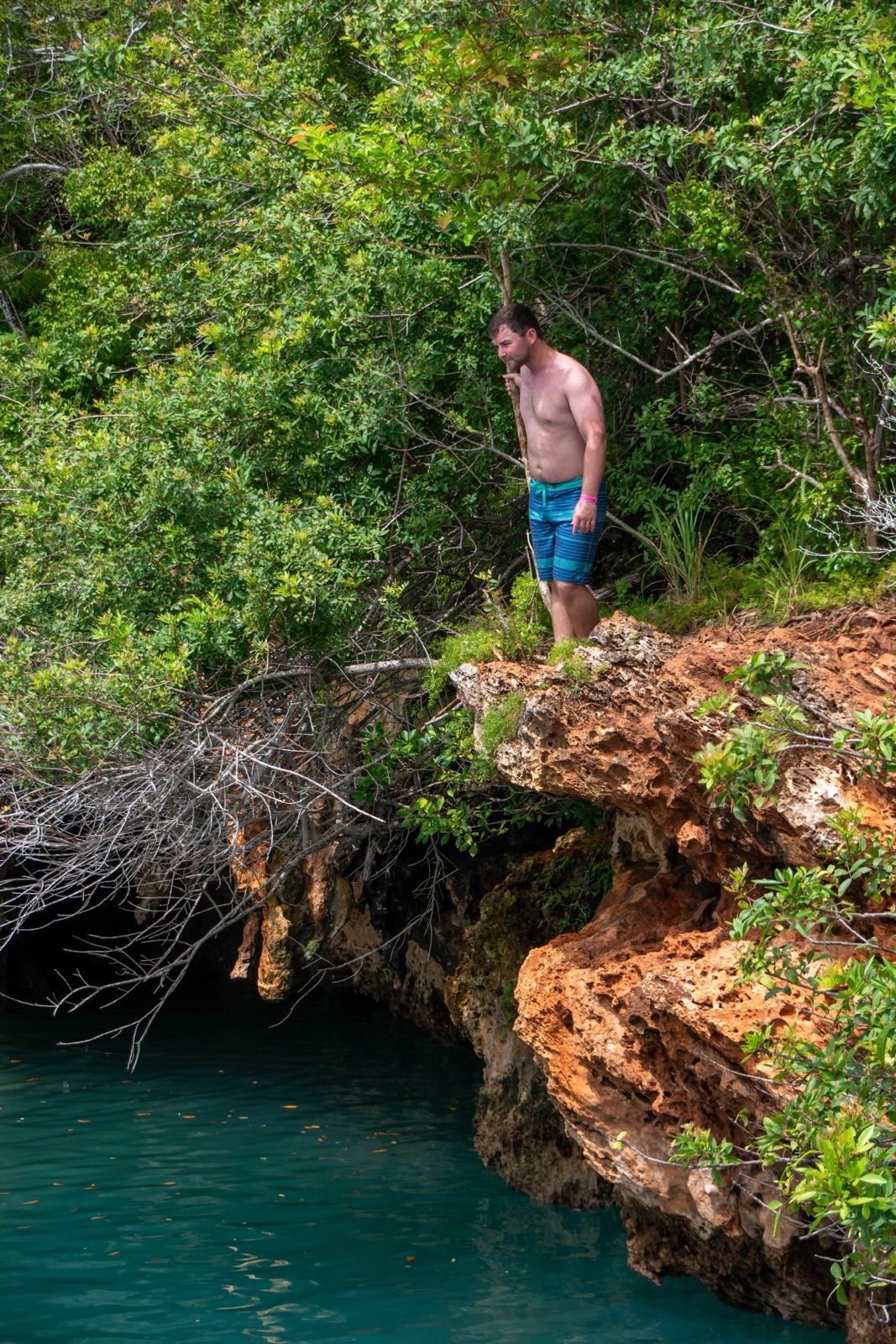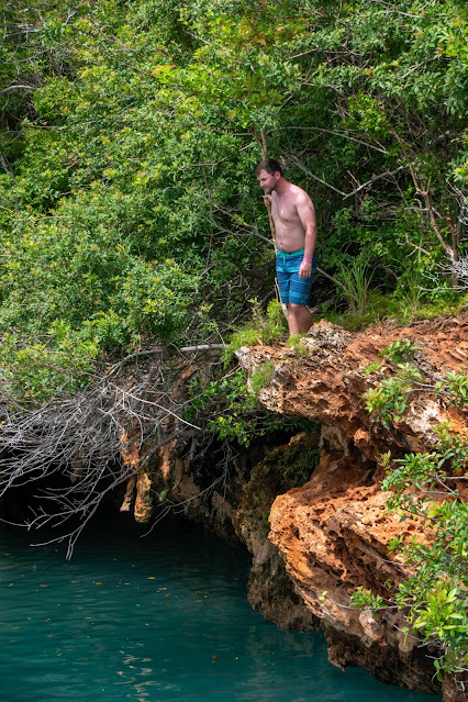 Finally we reached the Blue Hole, a water hole in the middle of limestone. There were a couple muddy paths that went to jump-off ledges at different heights.