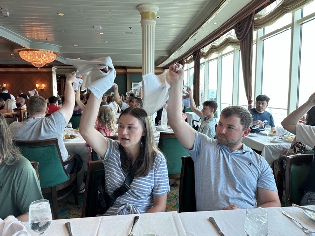 That night at dinner, some music played, and the waiters danced to "I Gotta Feeling."