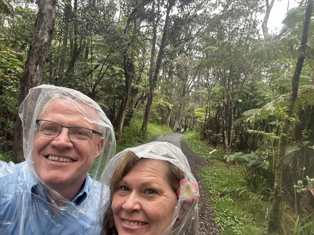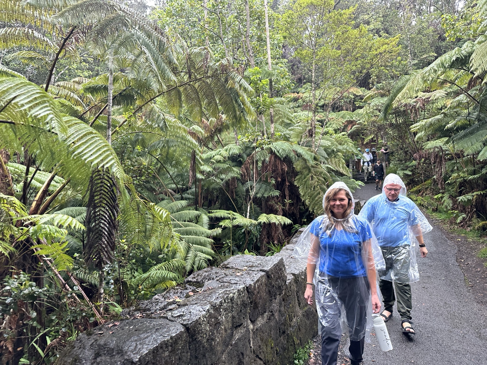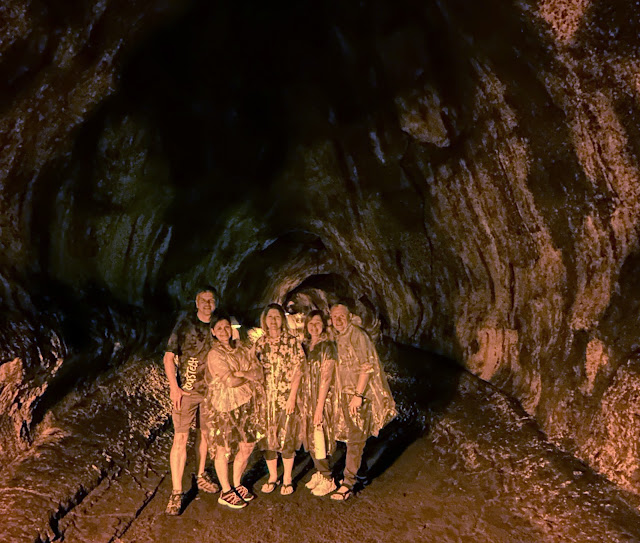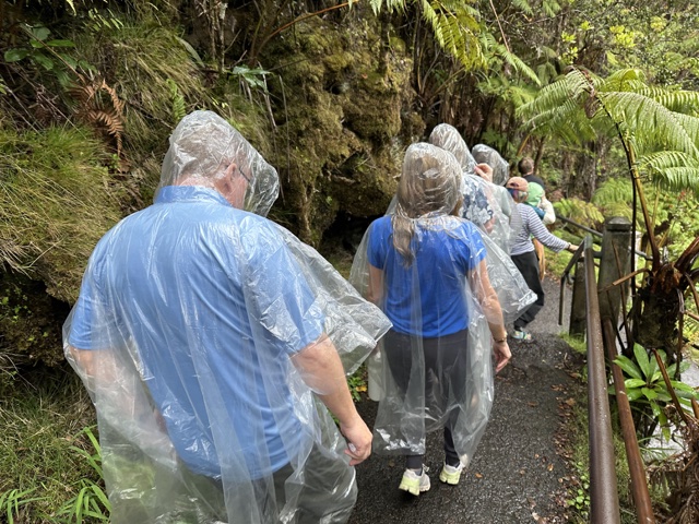 We decided to do a half-mile hike through a lava tube. It was raining by then, so we wore ponchos. (A kid asked her mom what those were, and she had to explain them).