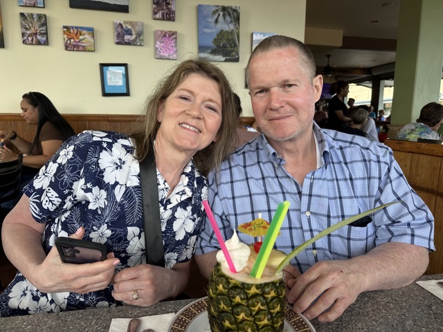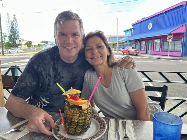 With that, we drove back up the road and over to Hilo, where we found a highly-rated restaurant called Pineapple Island Fresh Cuisine. Lori & Jim got a drink in a pineapple (it only seemed appropriate).