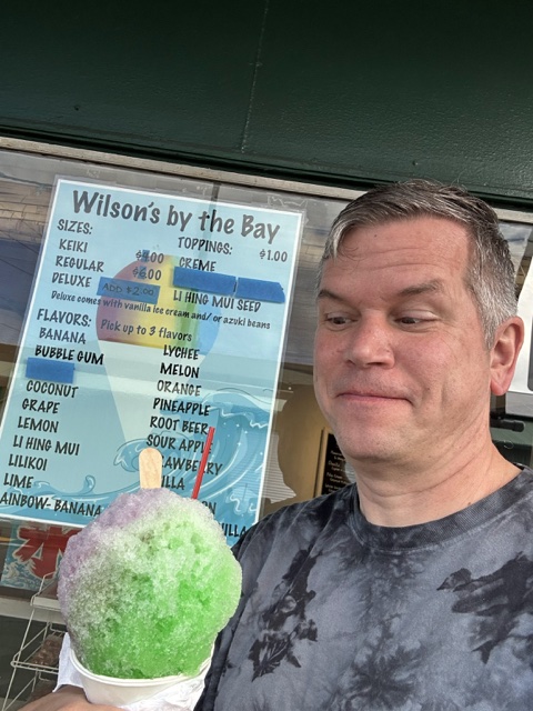 Kalyssa told us we had to get shaved ice while we were in Hawaii, and there was a place called "Wilson's by the Bay" right across the street. For $2 more, you can have them put ice cream in the middle, so I did, just to get the full experience (though I didn't actually eat the whole thing).