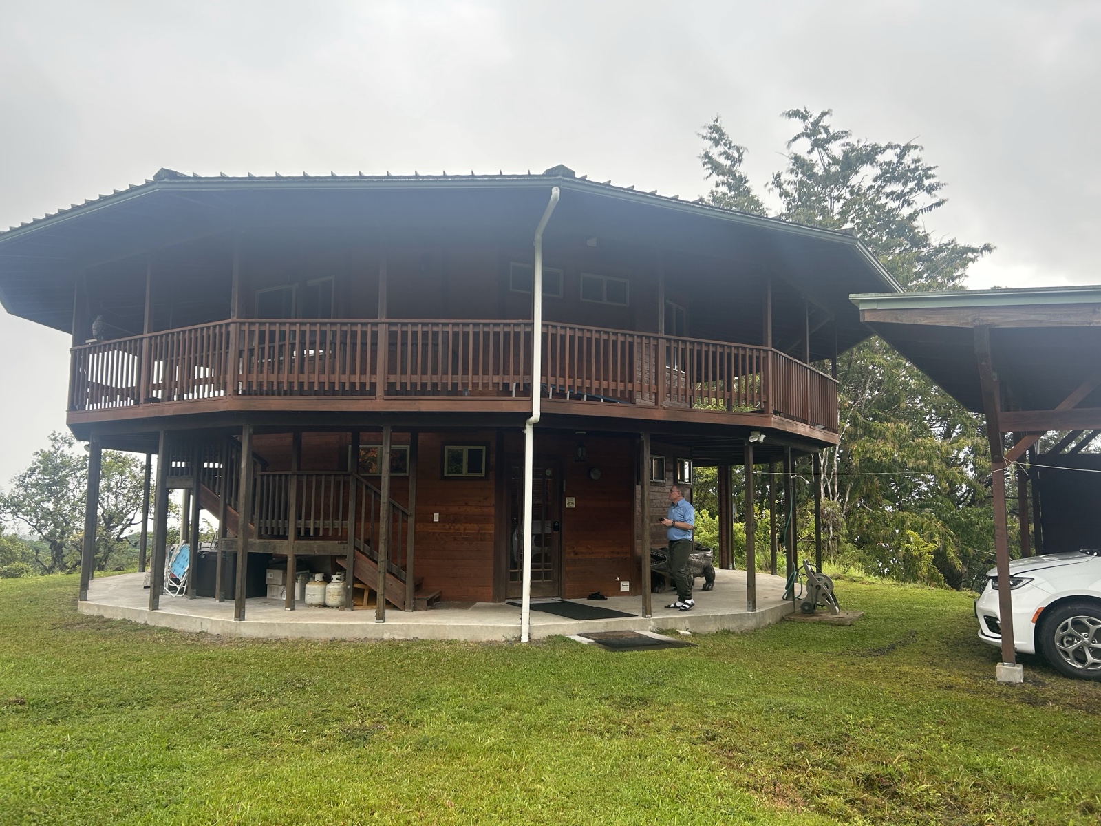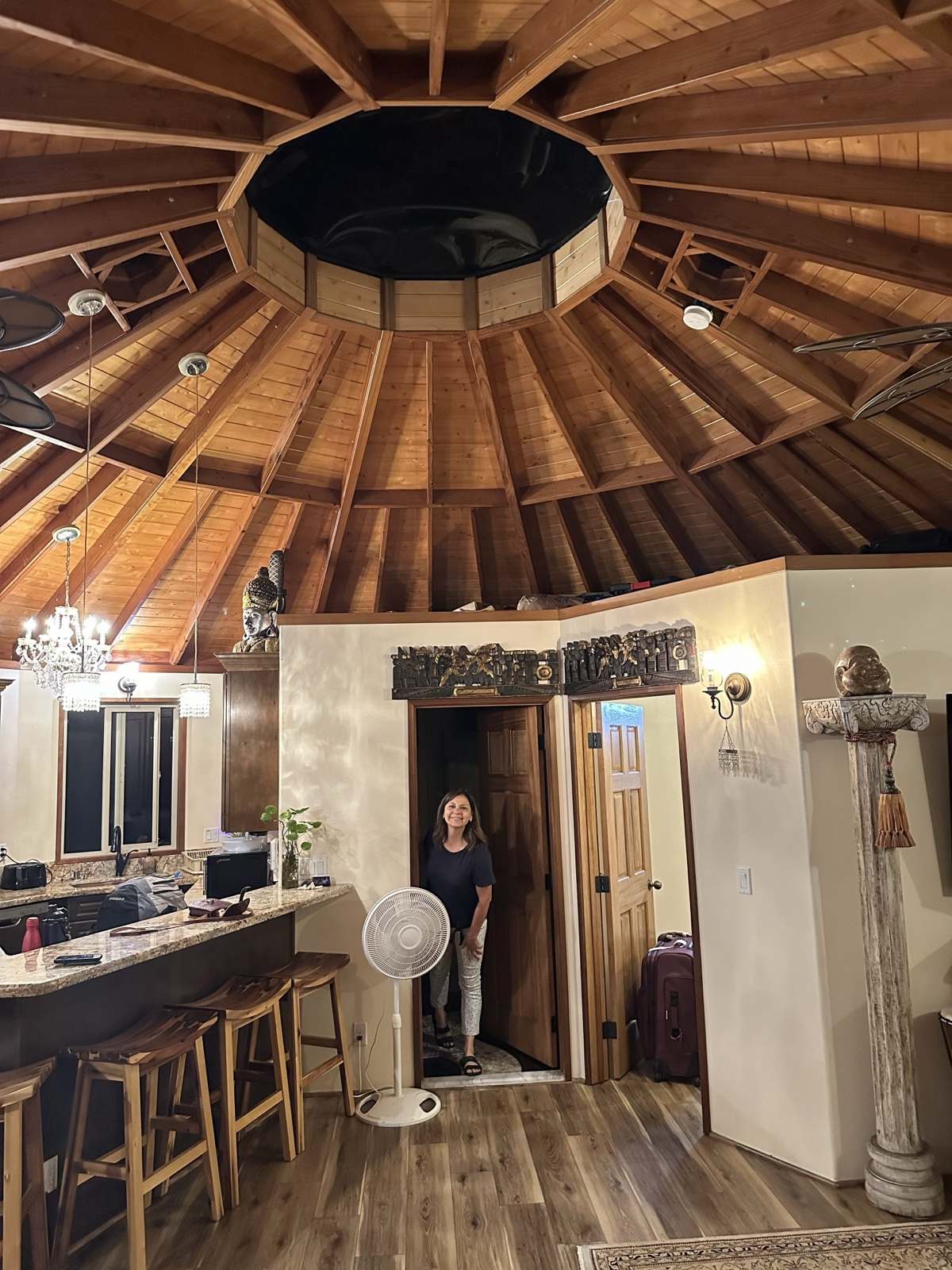 Our rental house was round, made largely of cedar and redwood, and had a deck that went all the way around the outside. I loved how the ceiling looked upstairs.