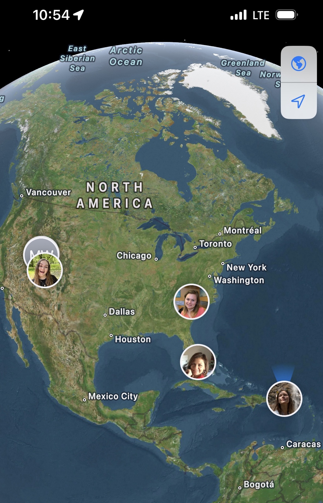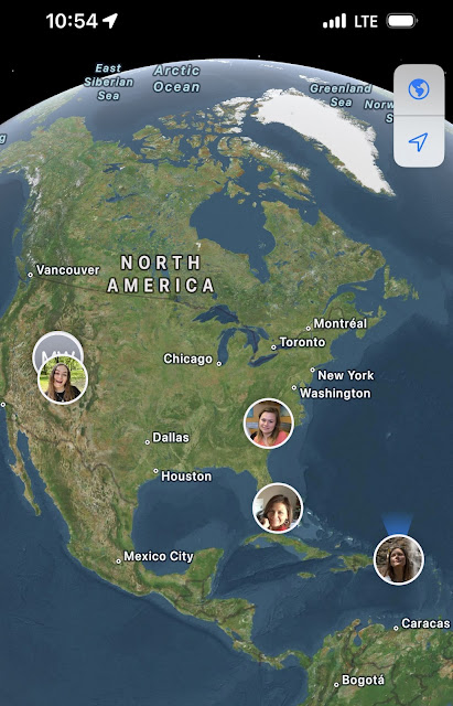 When we arrived in Puerto Rico, I looked on the "FindMy" app, and it was funny to see our family scattered all across the country. I hoped we would all converge on the same place at some point. (Linette was still on airplane mode, so it made it look like she was still in Miami).