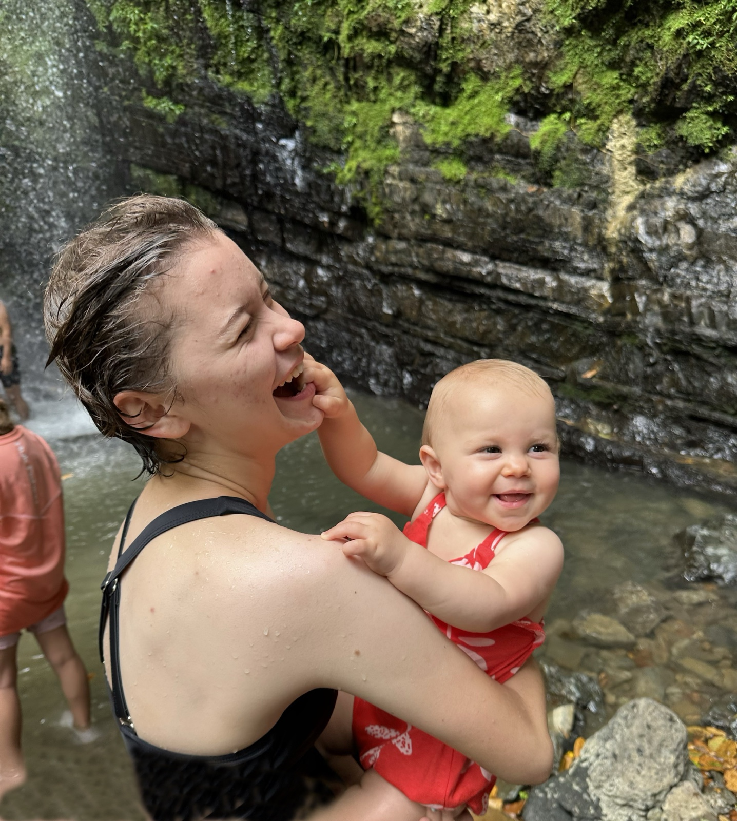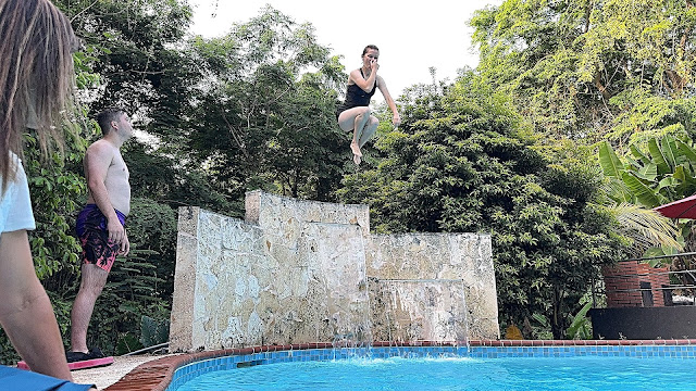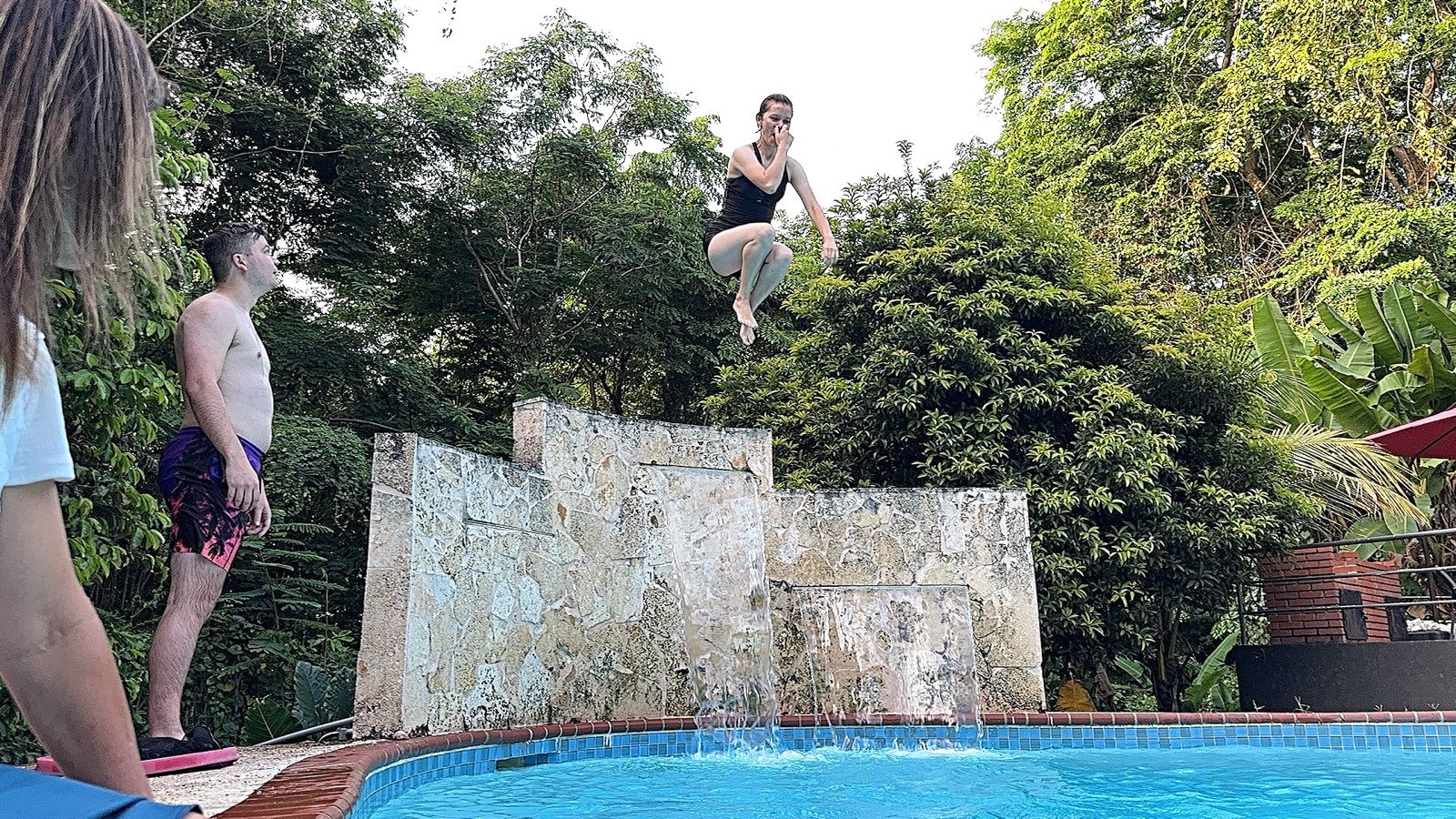 And Sienna and others took turns jumping off of the waterfall into the pool.