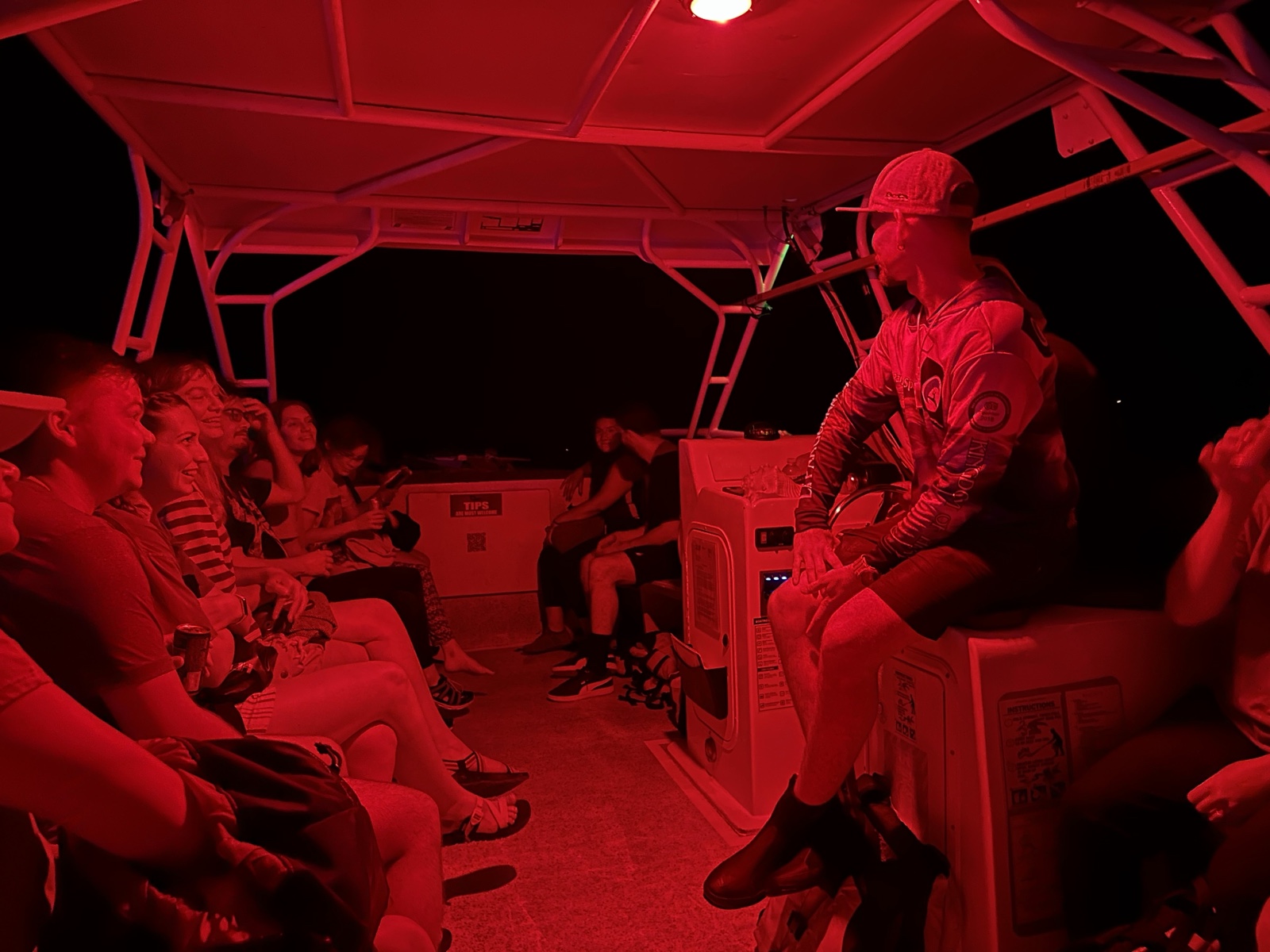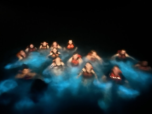 A boat took us 40 minutes or so across the water. Along the way, they taught us that the bioluminescent effect is caused by Dinoflagellates, which are single-celled organisms that live in the water and light up when the water is agitated. It's a cool light, meaning that very little heat is generated and glows blueish white.