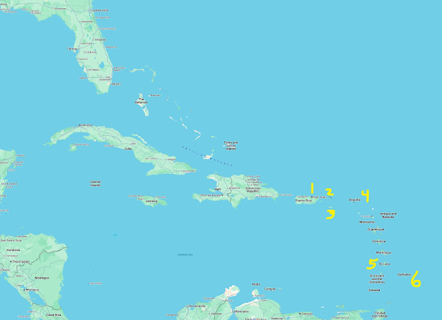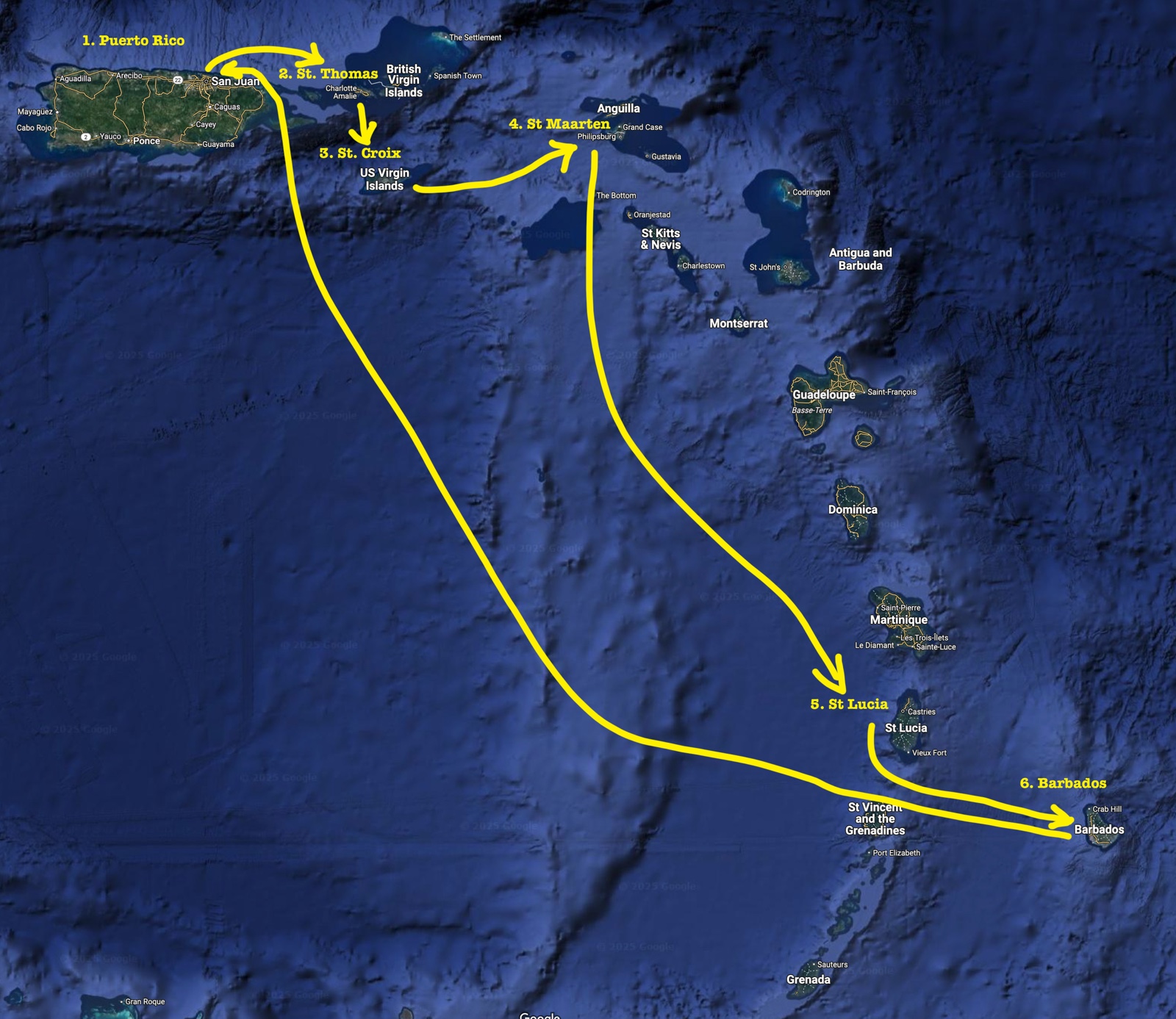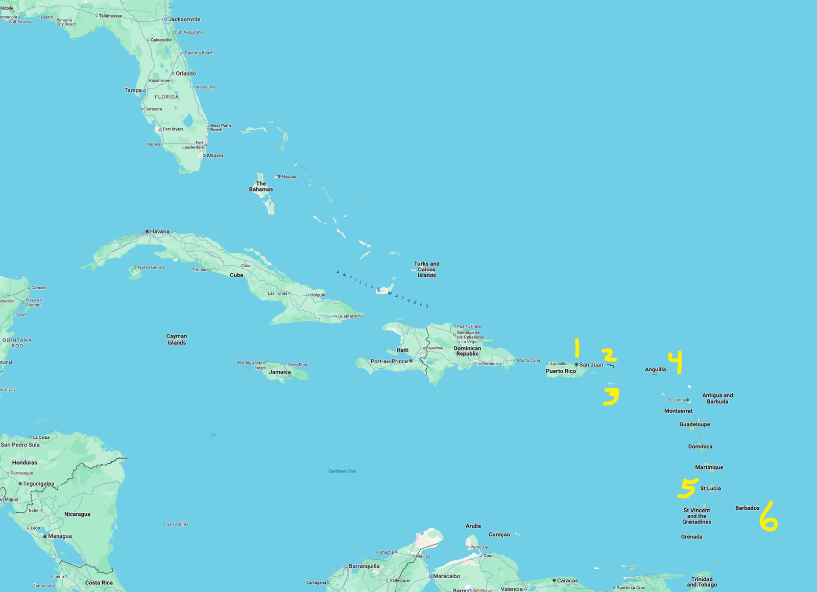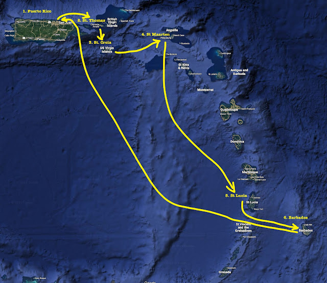 Zooming in on Puerto Rico and the other islands, you can see the route we took and where these islands are.
