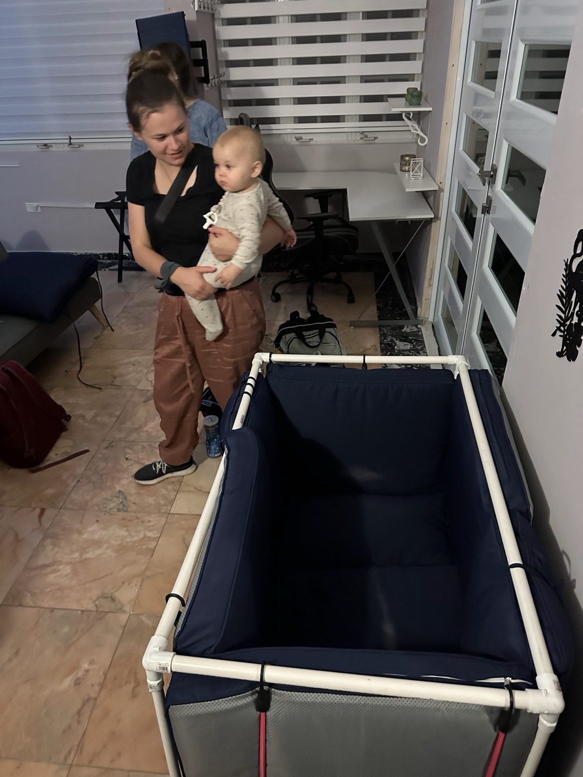 There wasn't a crib available the first night, so someone fashioned a rudimentary crib out of the patio furniture bin and some bungees. Eva didn't end up using it, but I thought it was genius.