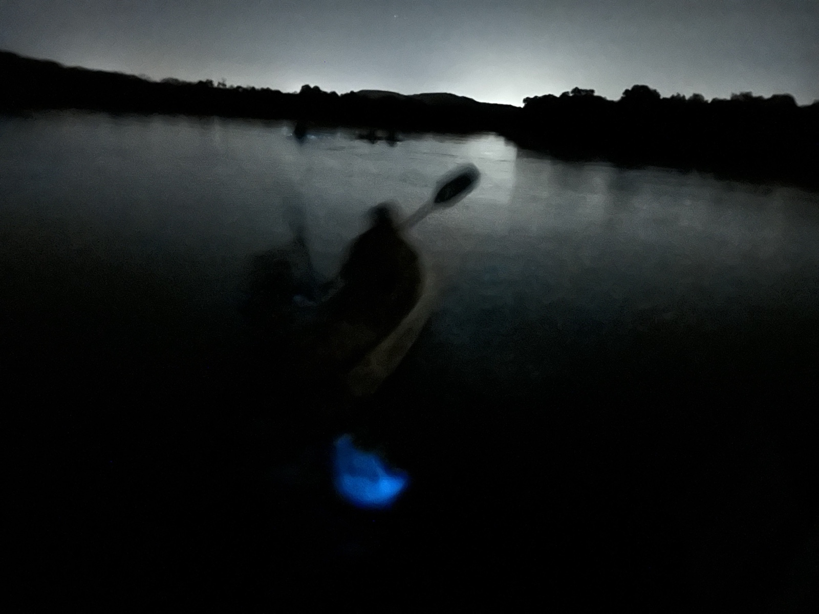 But soon we arrived at our destination and climbed onto kayaks. Here you can see a glimmer of light around one of the paddles.