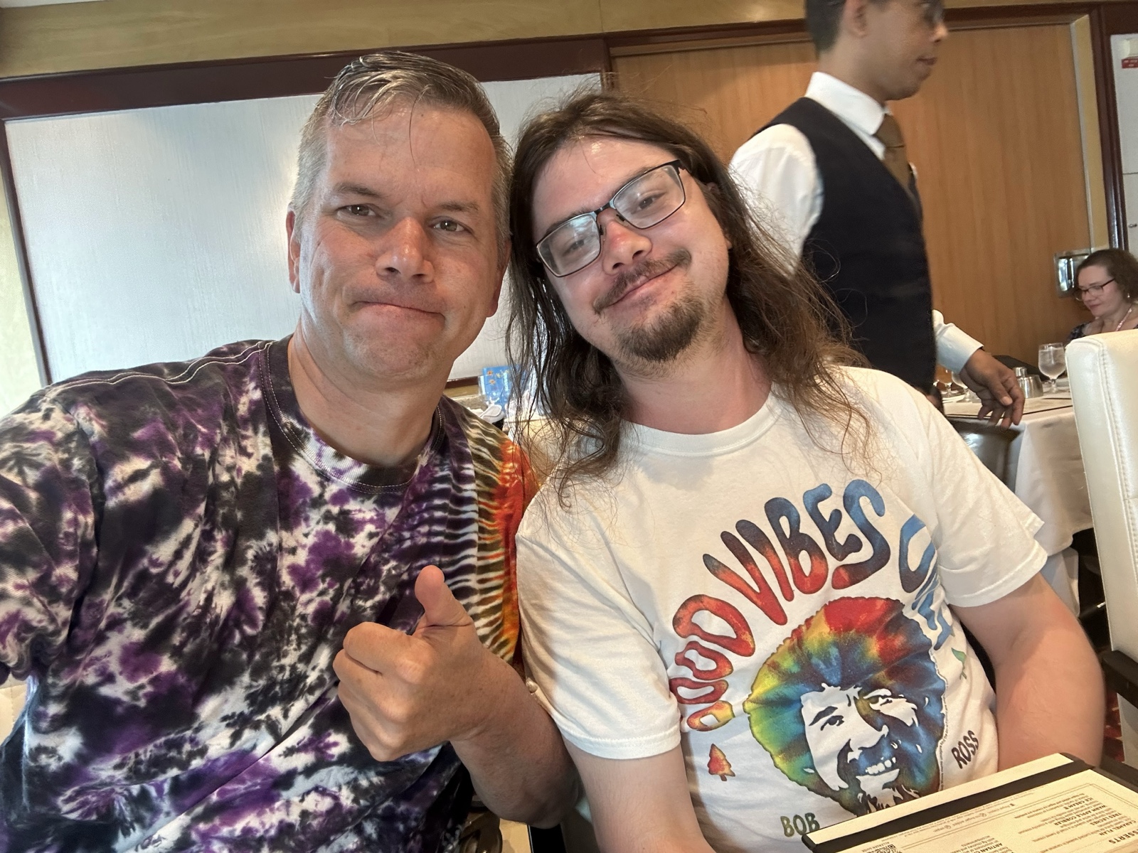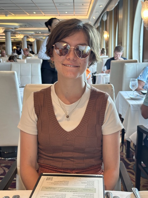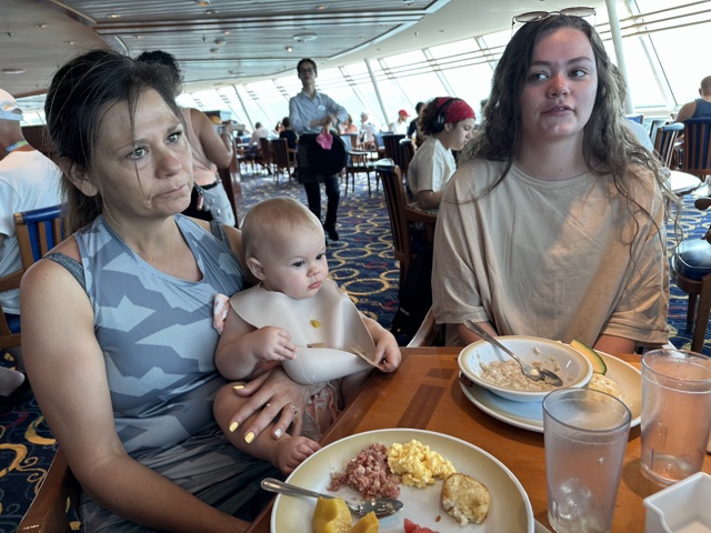 On Tuesday, June 24, 2025, we trickled into the Windjammer for breakfast. Linette helped feed wee one while Kelsi got some food. (I love how bibs now have a trough to catch all the falling food.)