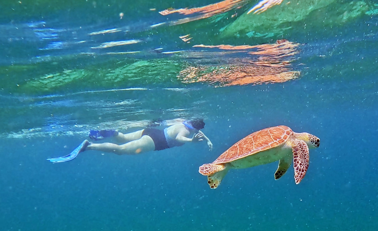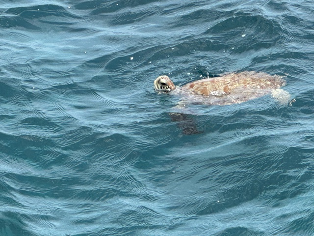 I ran back to the ship to get my snorkel gear, and from the pier, I saw this turtle swimming around.