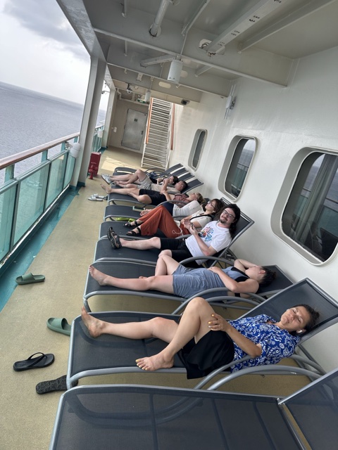 Eventually, we all got back on the ship, and via the onboard chat, we found that someone had found a nice secluded area by the Solarium where we could all relax in the shade and read books and such.