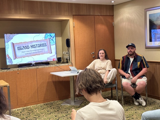 That evening, we found an empty conference room and Erika gave a Powerpoint presentation about the history of the islands we were visiting on our cruise. There was some text to read on each slide, so to keep it interesting, she used a trick from her elementary school teaching where she reads it aloud, but sometimes snaps and we all read that word aloud. It was fun and we learned a lot.