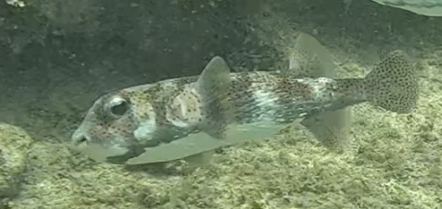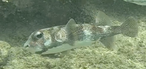 - I saw a pair of Porcupinefish. These have spines that lay flat along their bodies unless they are threatened, at which time they puff up like a pufferfish and the spines provide some protection.