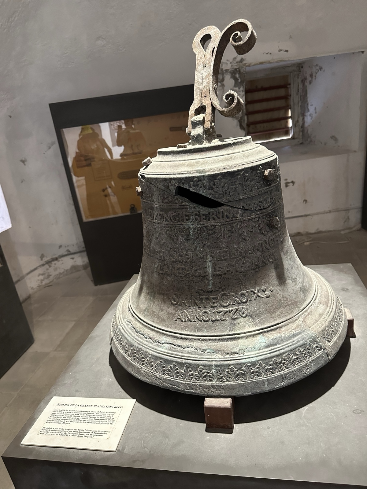 One room talked a lot about the slave trade in the area. This bell had a crack, but instead of calling it the "liberty bell," we called it the "slavery bell." It was used to call enslaved persons to labor each day. However, it was later used to rally the enslaved together to protest slavery, and rang again to celebrate emancipation. Slavery was abolished by the Danish in 1792, and no new enslavements happened after 1802, but the enslaved people weren't set free until they demanded it in a revolt in 1848. Hundreds of enslaved people peaceably gathered outside this very building and refused to work the next day unless they were freed. The governor agreed, and now they celebrate emancipation day on July 3.