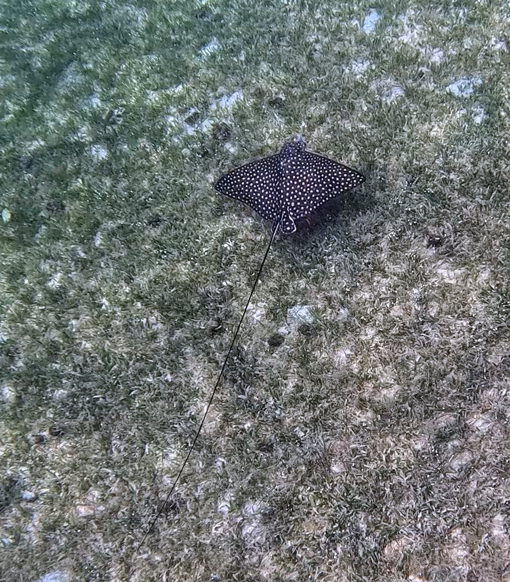 I had fun snorkeling there. The coolest thing I saw was a "Spotted Eagle Ray" with a really long tail. I followed it around for a while. Here's a frame from my GoPro video footage.