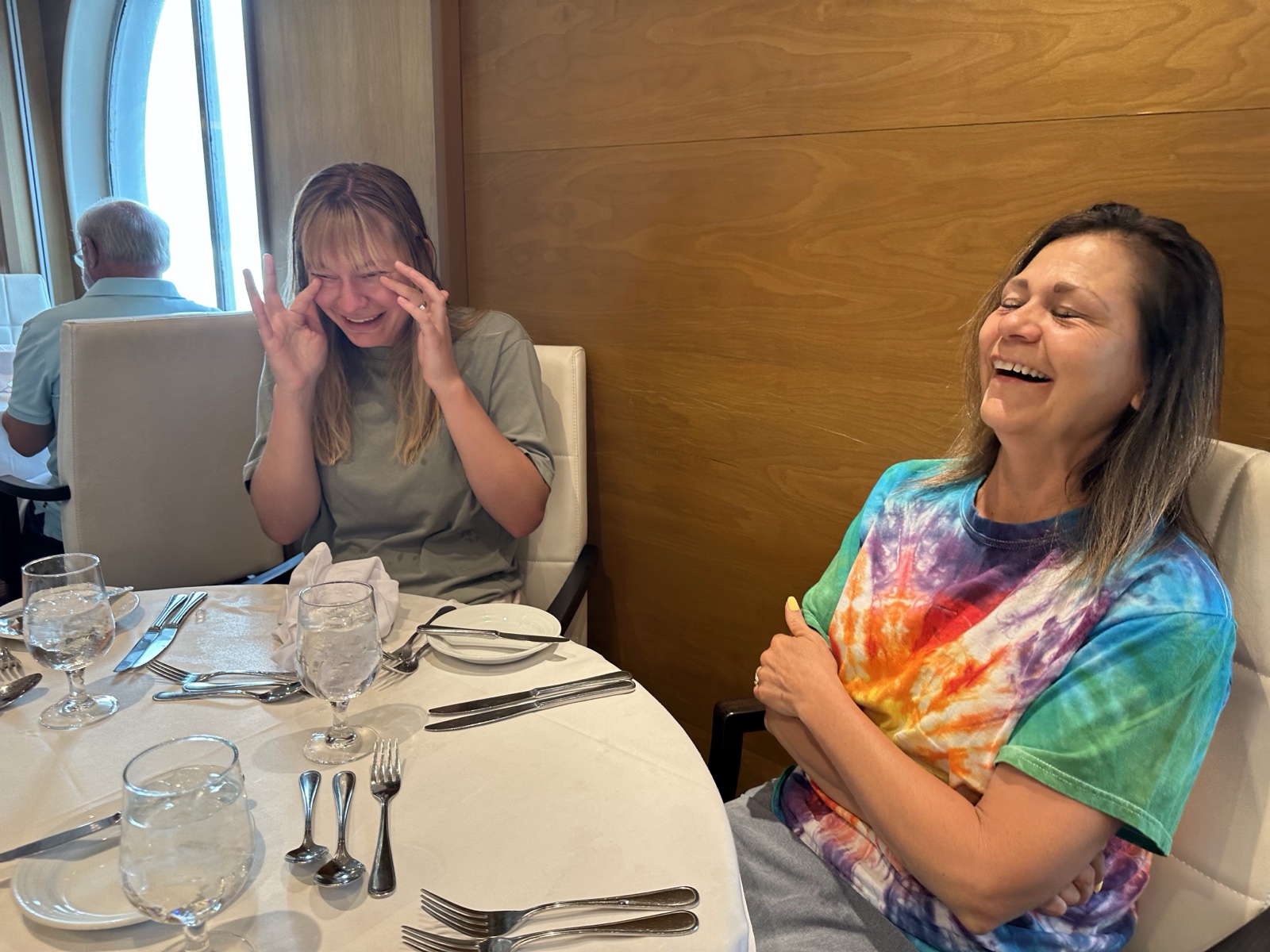 As we were waiting for food to be served, Linette reached over and knocked over her glass. Everyone laughed, and the waiter used cloth napkins to dry things off. Just as we were calming down from that, Linette knocked her glass over AGAIN!! This time, everyone lost it.