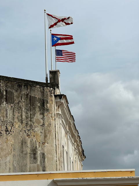 Here you see three flags: The Cross of Burgandy (representing the Spanish Empire), the single-star flag of Puerto Rico, and the U.S. Flag.