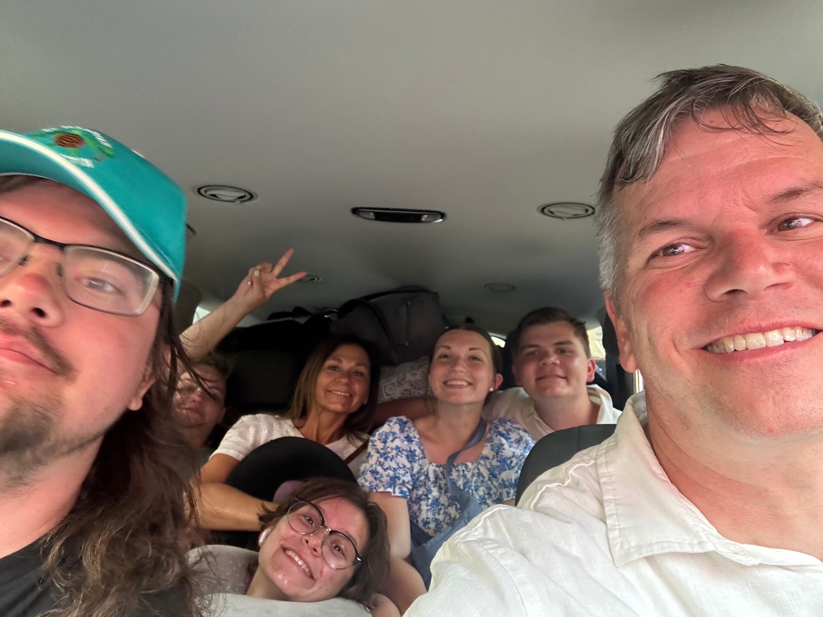 Our flight was at 7am, so we had to get up at 4:30am (which is 2:30am Utah time) to get to the airport. We packed our bags high and smushed in again.