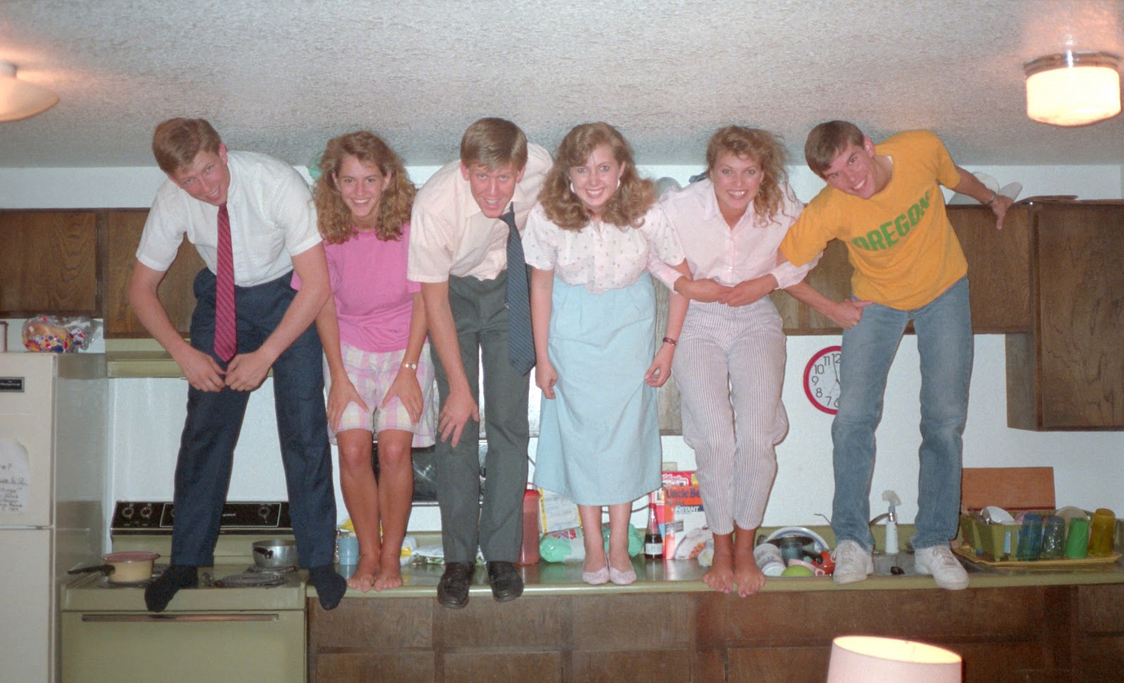 Devaughn was dating a girl named Kim, and they both hung out with us quite a bit, especially when Devaughn moved into our apartment the next spring. Here is a funny picture with Darren, my sister Sharon, Devaughn, Kim, our friend Amie, and me. (Taking the picture was my idea. Jumping up on the counter for it was Darren's).