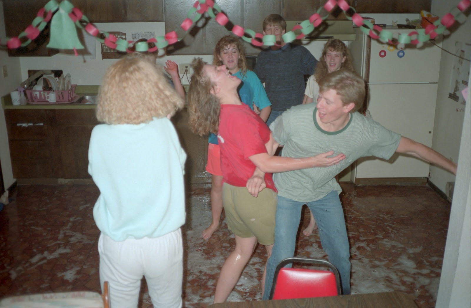 We had a lot of fun in college. For example, one time we did an "ice cream mash", where we opened a few cartons of ice cream directly onto the table, added our favorite candy bars, and mixed it all up. Then a girl named Karla said, "What if I just...flip some..." Well, an ice cream fight ensued. In this picture are several people related to our trip, including Sharon (second from the left), Steve Stevens (fourth from left), Darren (next to him), and the rightmost three are Kim, Devaughn and me (Randy).