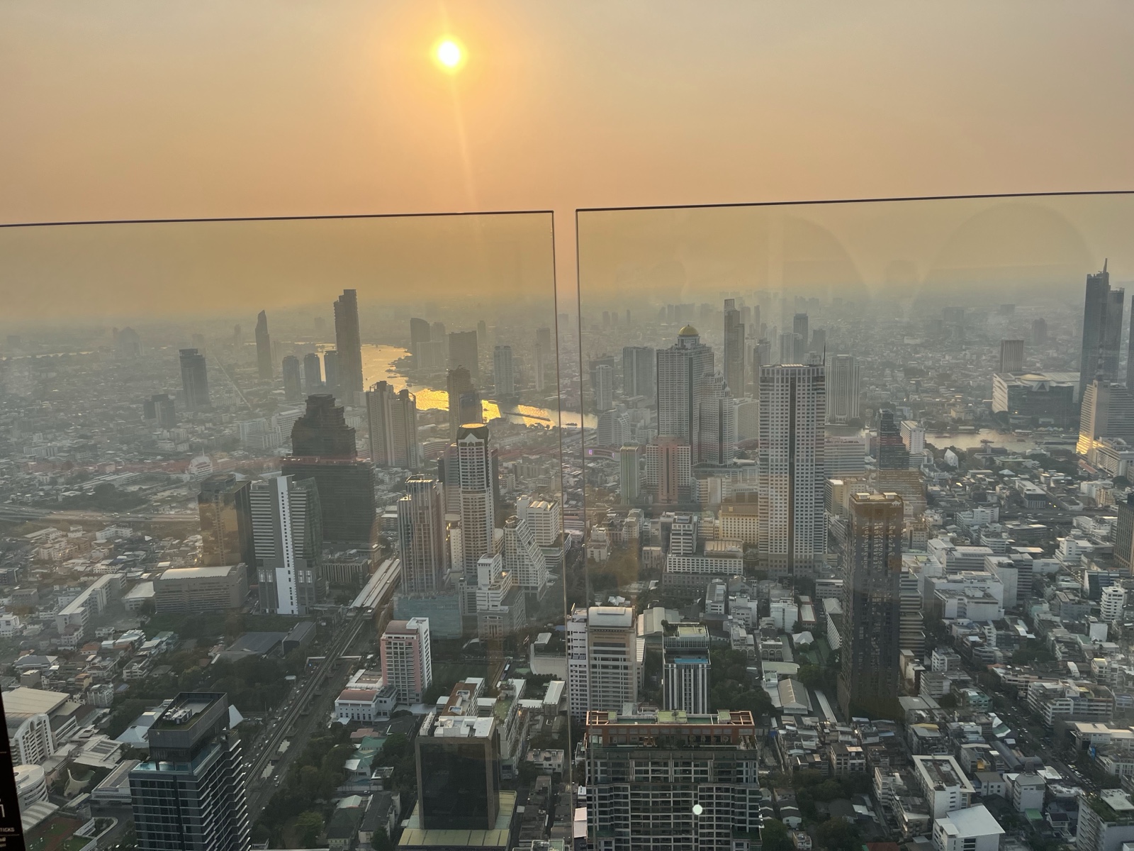 The sun started to set during the time we were there. You can see here that there is a layer of smog over Bangkok, which makes for pretty sunsets but unhealthy breathing. There are 11 million people living in Bangkok, and the air pollution is equivalent to smoking 3-4 cigarettes per day. Still, it was cool to look out and see this massive city from such a high vantage point.
