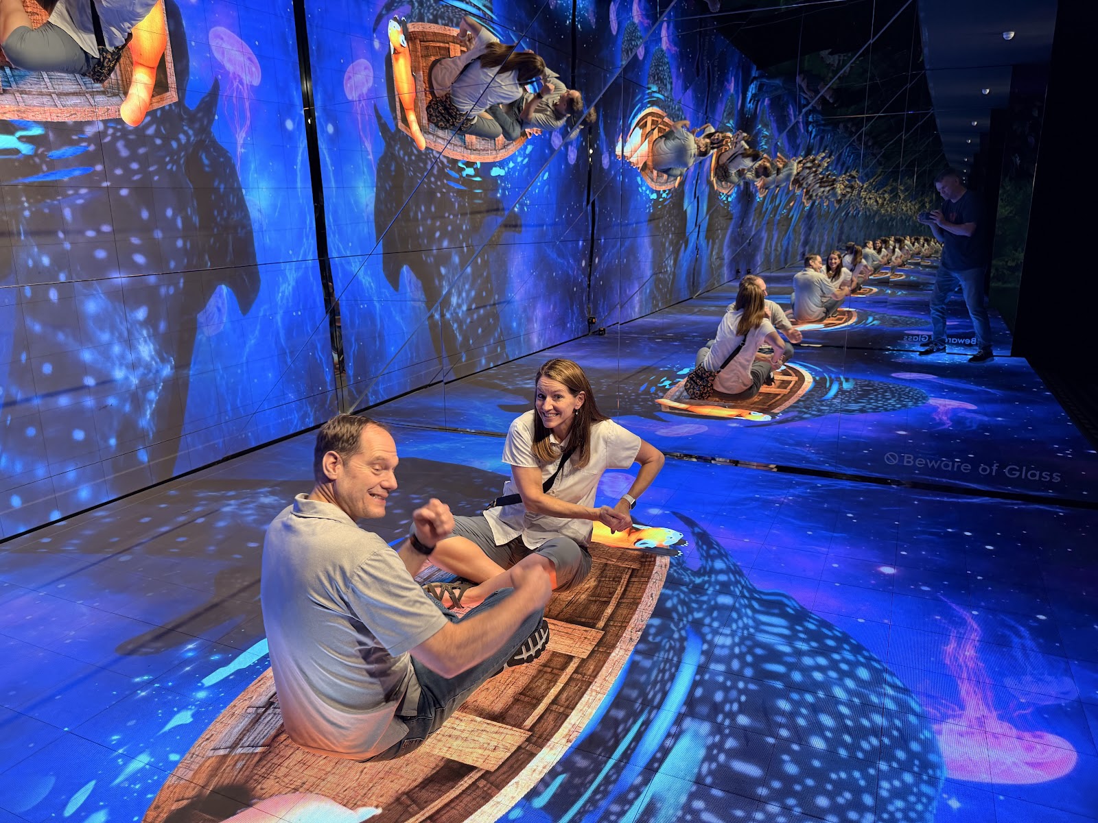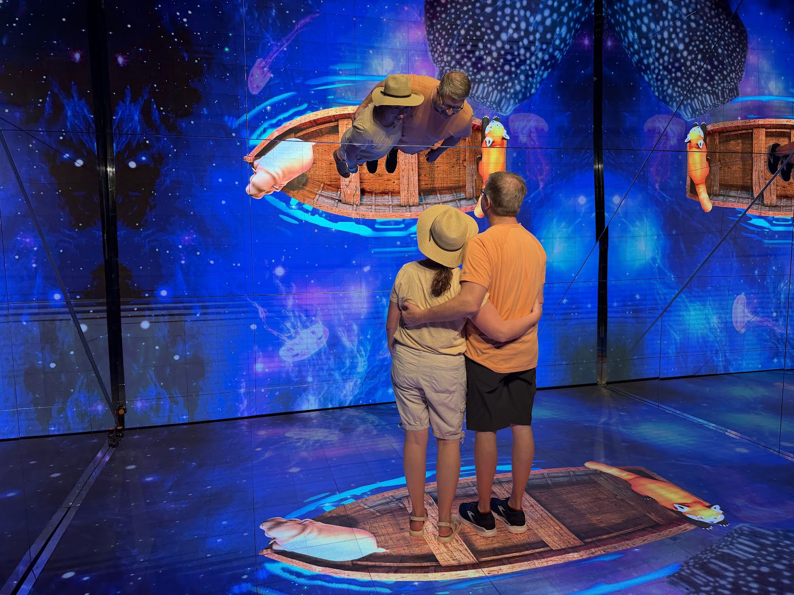 Another room had a boat with a diagonal mirror above it and mirrors on both sides. When you walked on the water, it would react with little splashes.