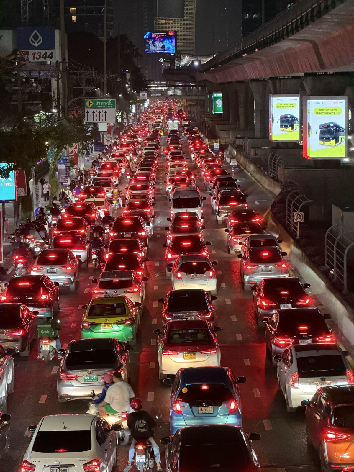 As we walked back to the hotel, we went over a pedestrian bridge, which gave us a nice view of the awesome traffic in Bangkok. You can see why people would want to ride scooters, since they can go in between all the cars, which have a hard time moving much at times.