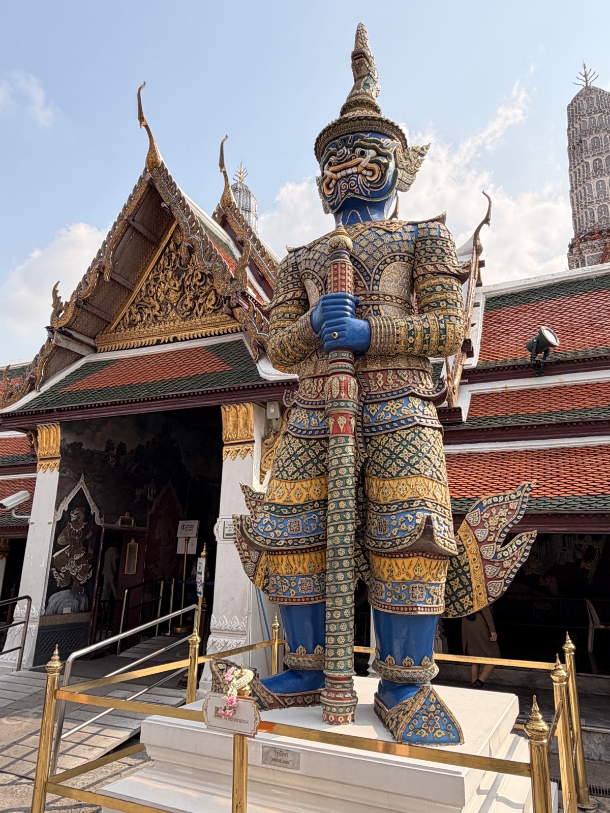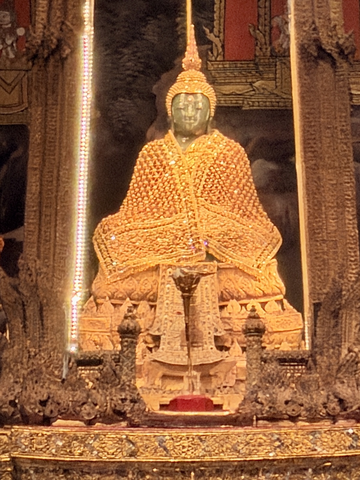This is the famous "Emerald Buddha". It is made of jade or jasper (the "emerald" refers to its color), and legend has it that it was created in 43 B.C. (!). It was discovered in northern Thailand in 1434, and made it to its current location by 1785.